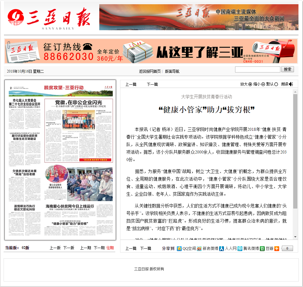 三亚日报报道公司健康学子“健康 扶贫 青春行”全国老员工暑期社会实践专项活动