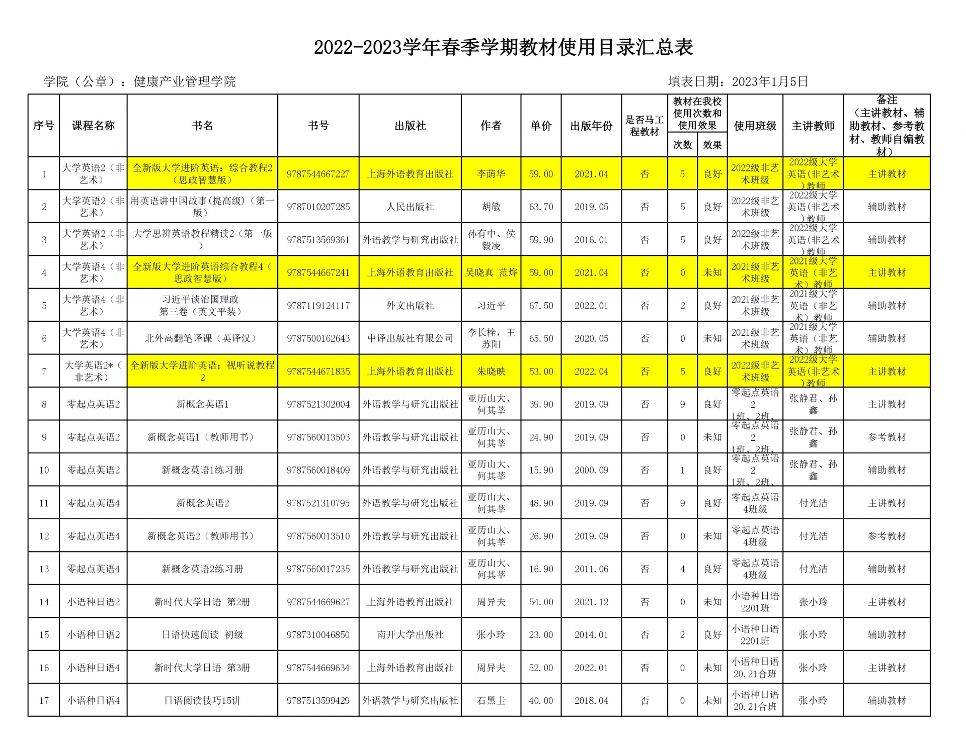 新葡的京集团350vip88882022-2023学年春季学期教材使用目录汇总表