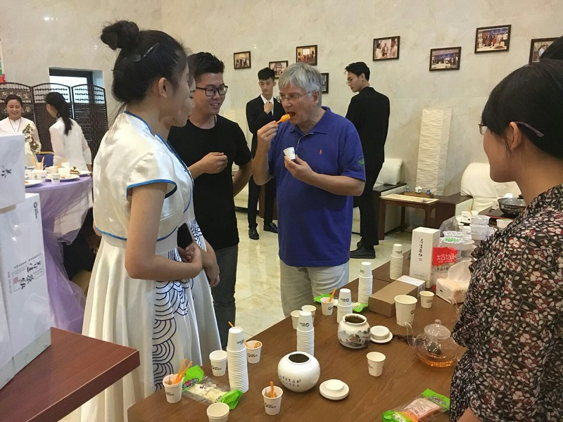 (公司傅萍副经理与瑞典大使夫人品尝药膳食品)