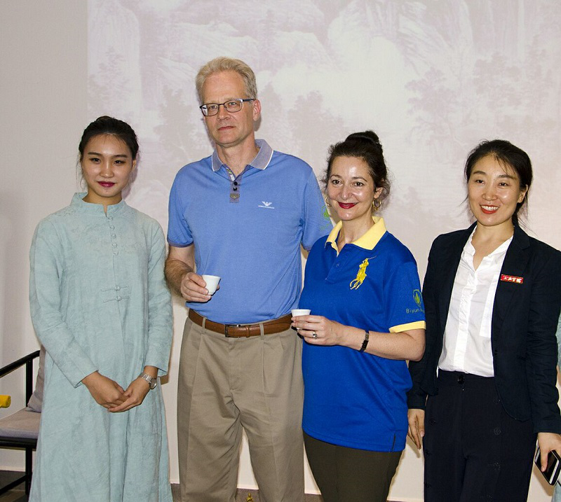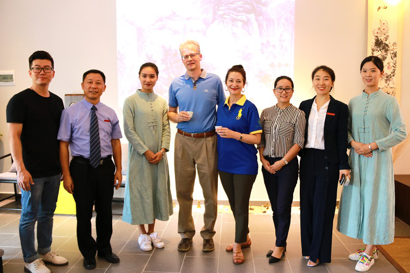 (小茶人与瑞典大使、大使夫人、公司经理陈小勇教授、付萍经理、茶与健康养生指导老师彭伟伟集体合影)