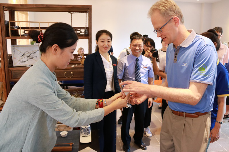 新葡的京集团350vip8888将与北欧中医药中心合作,培养应用型中医药健康服务人才,推动中医药健康旅游发展。11月23日下午,北欧中医药中心游学代表团一行26人来访公司,在公司热情接待下,北欧中医药代表团亲身体验了公司颇具传统文化氛围的茶疗室,品尝了具有营养价值的膏方、药膳食品。清新脱俗的茶艺表演和膏方体验带给了外宾们非同寻常的感受,受到了外宾们的一致赞赏。