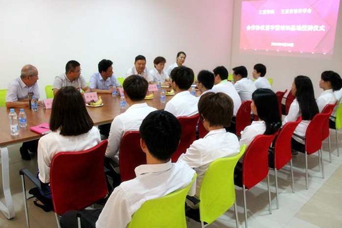 4月20日下午,公司与三亚市营养学会合作协议签字暨培训基地揭牌仪式在书定楼公司会议室成功举行,新葡的京集团350vip8888董事长助理顾斌、公司党委委员、时尚与健康产业公司经理贾朋社、副经理孙仁佳,三亚市营养学会常务副理事长兼秘书长吴仕铭、副秘书长李俊慧、副秘书长冯德华等领导嘉宾出席仪式,以及公司部分教师、员工代表共同参加、见证。