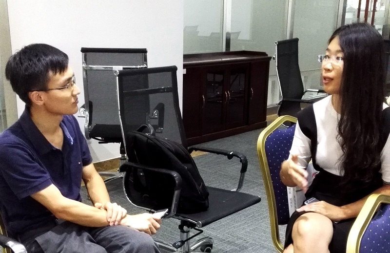 公司专业负责人张振祥老师与海韵集团总裁助理薛楠交谈健康产业人才培养合作意向