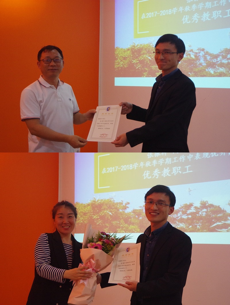 随后,公司进行了2017--2018秋学期优秀员工表彰环节,分别由陈小勇教授为健康产业专业负责人张振祥颁发证书并赠与鲜花,傅萍经理为思想导师王璐婷颁发证书并赠与鲜花。
