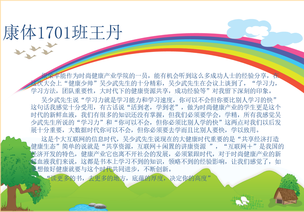 吴少武教授的《强化学习力,用共享经济打造家庭健康生态圈》专题演讲仅仅短暂的一个小时,相信同学们都意犹未尽,欢迎并期待着他的下一次演讲。星星之火可以燎原,在健康产业的道路上我们的力量还很单薄,还有许多的困境坎坷在等着我们,我相信我们不会辜负前辈们,老师们甚至是人民们的期待,在时代的大舞台绽放光芒!(图文发布实际日期:2018/01/23)