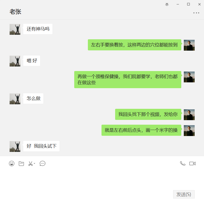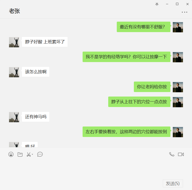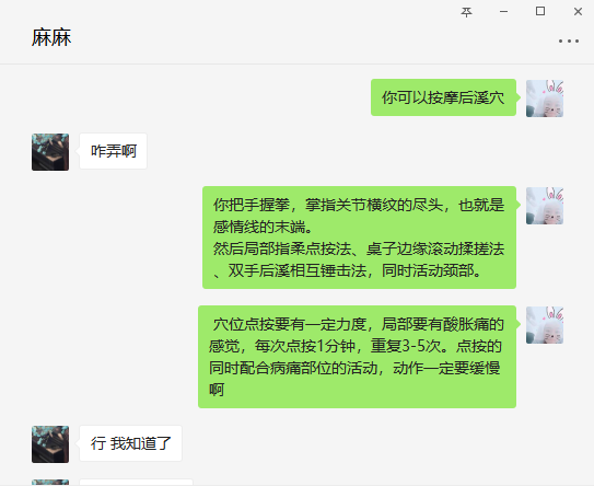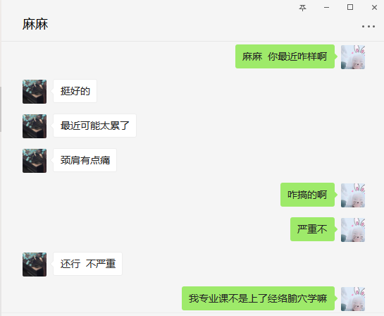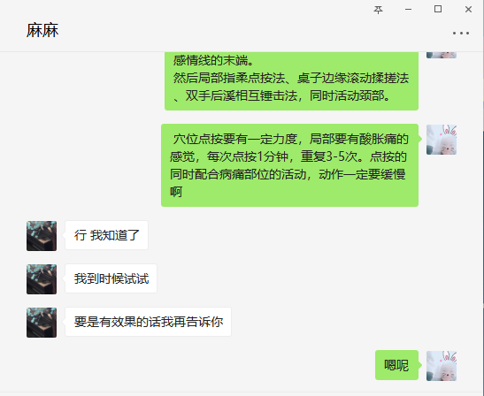 我是纪姝圻的妈妈,前段时间一直感觉颈肩痛,我姑娘向我推荐的几个治疗颈肩痛的穴位,让我感到很暖心,也很有效果,缓解了肩颈的疼痛。真的能够感受得到,在大学的这一年,让她改变了很多,成长了很多,平时会发一些和她们专业相关的健康小贴士给我,这不仅仅是对我们父母尽孝心,更是让她自己收获的知识,对她自己也会有很大的帮助。穴位的按摩技巧都是她平时学习过后来教我的,希望她以后可以更加认真的学习,在公司照顾好自己。