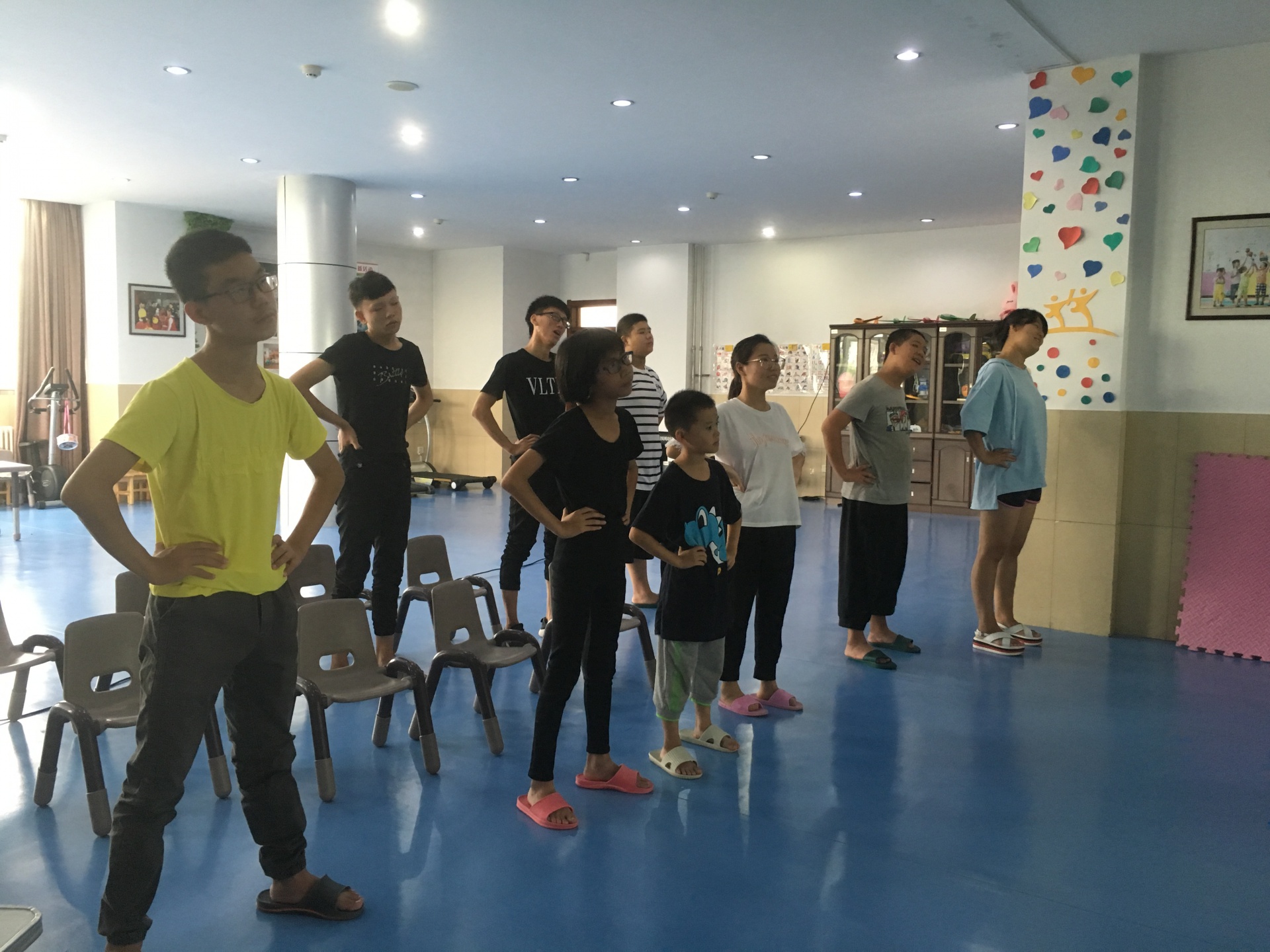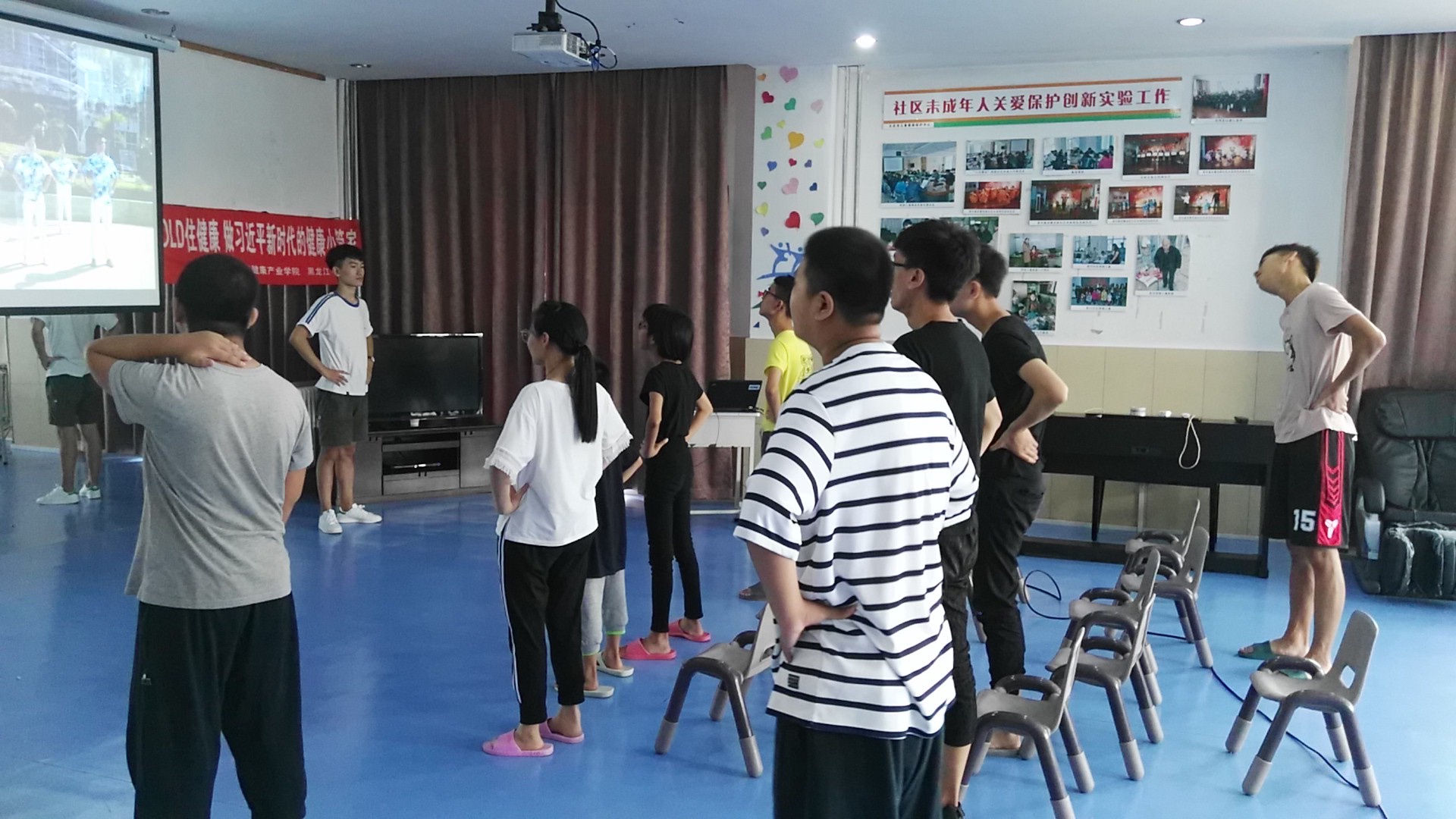(带领他们进行颈椎操的学习)