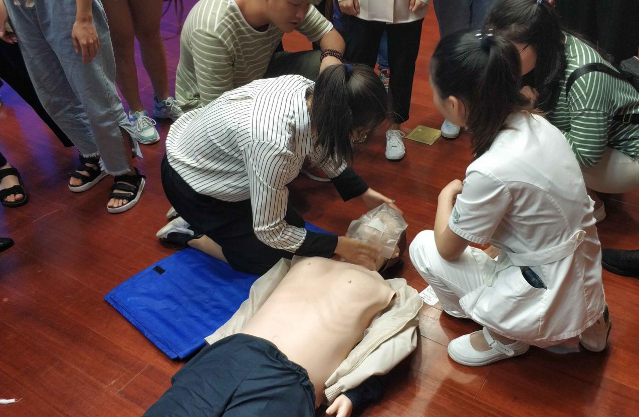 除了中毒之外,褚加静护士长还为同学们进行了急救技能培训,首先为同学们亲自演示讲解在意外受伤后如何止血。在生活之中还有另一种比较常见的、严重的意外事件就是溺水救护——心脏复苏。褚加静护士长与一位护士亲自为同学们进行了演示,不仅教了同学们心脏复苏法,并指出生活中不只大人会出意外,婴幼儿更是我们应该关注的对象,故褚加静护士长与护士亲自演示了婴幼儿急救法的应用。