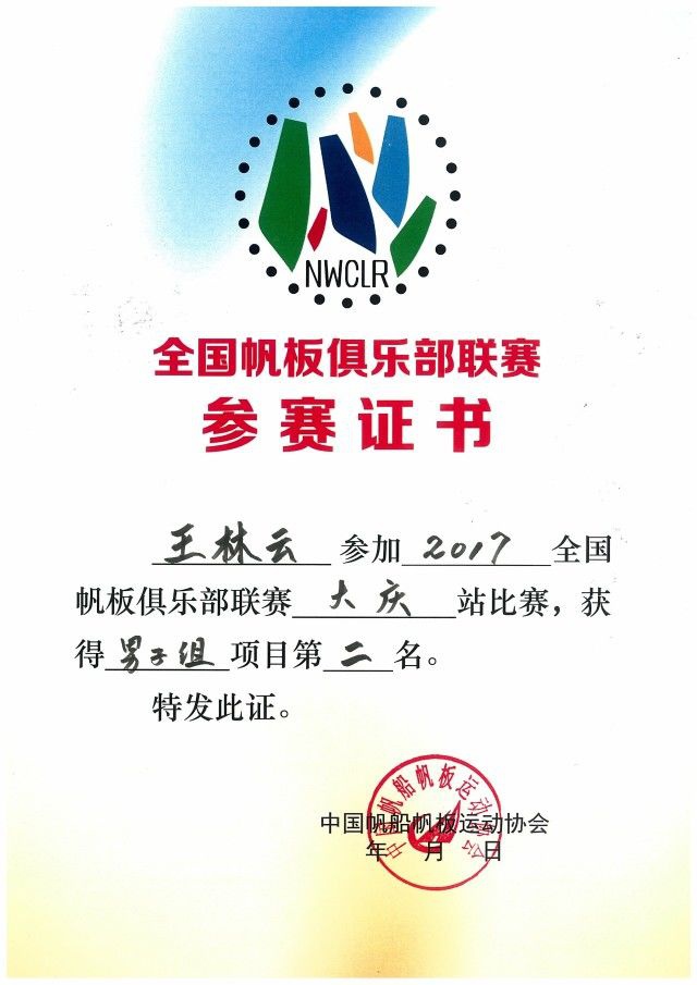 2017年参加帆板运动大赛获得的部分证书: