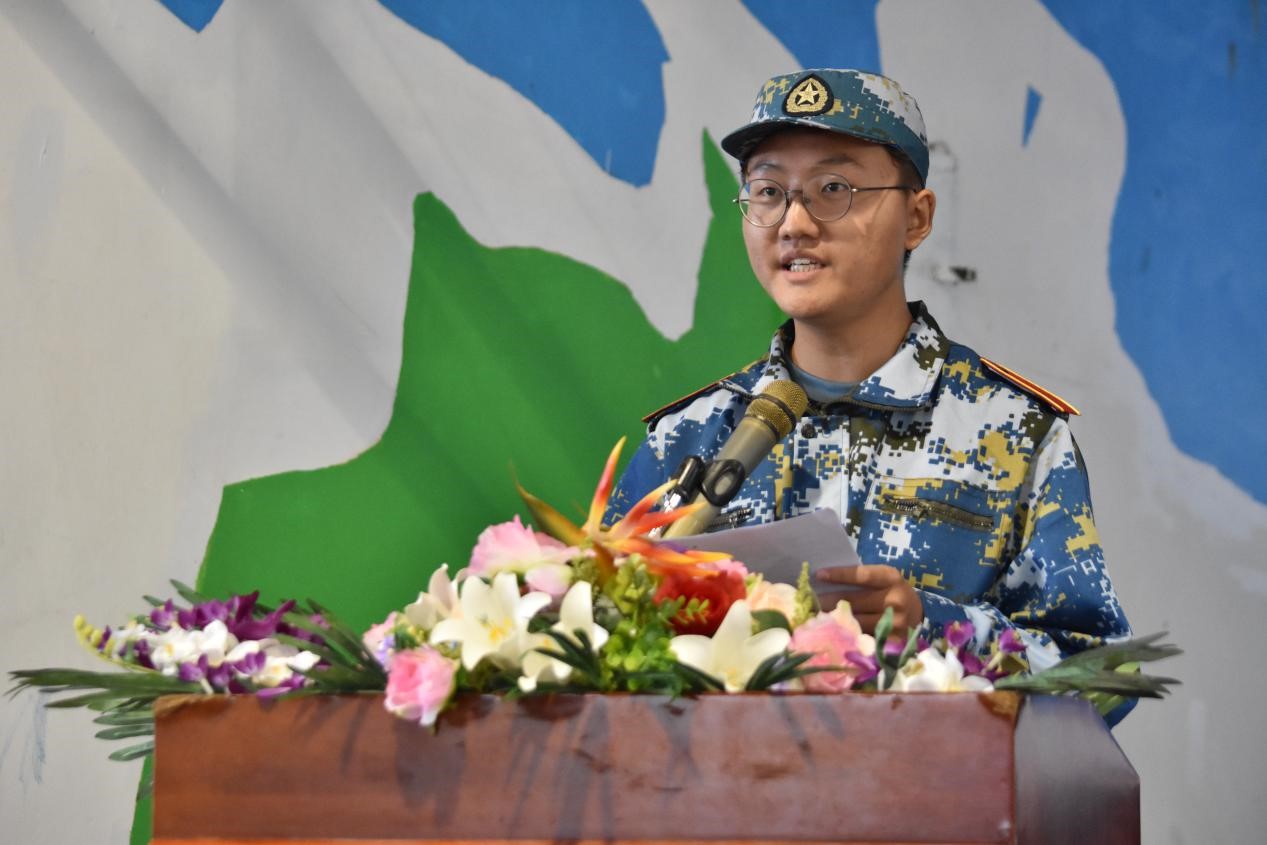 听着董事长助理隋珊珊那慷慨激昂的语调,感受军训的严肃。她讲到,军训是大学四年最重要的一门课程,也是一次自我锤炼、自我挑战的活动,也是国防教育的平台,增强综合素质的拓展,军训是为了培养我们军人精神,增强体魄,磨练意志,她希望通过军训同学们能够树立正确的理想信念,她相信18级萌新们会展现自我风采,有雄心壮志,不畏惧风雨,砥砺前行。