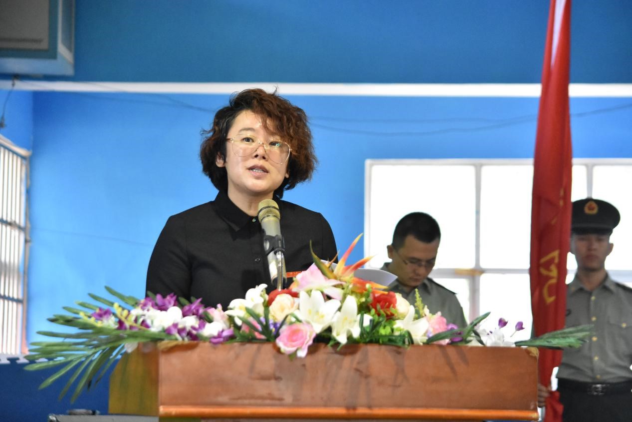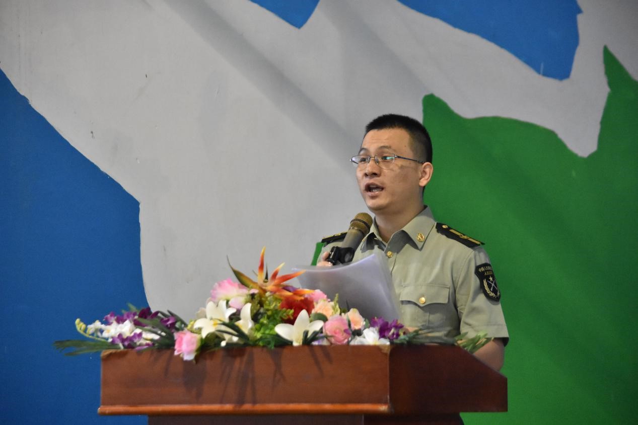 听着董事长助理隋珊珊那慷慨激昂的语调,感受军训的严肃。她讲到,军训是大学四年最重要的一门课程,也是一次自我锤炼、自我挑战的活动,也是国防教育的平台,增强综合素质的拓展,军训是为了培养我们军人精神,增强体魄,磨练意志,她希望通过军训同学们能够树立正确的理想信念,她相信18级萌新们会展现自我风采,有雄心壮志,不畏惧风雨,砥砺前行。