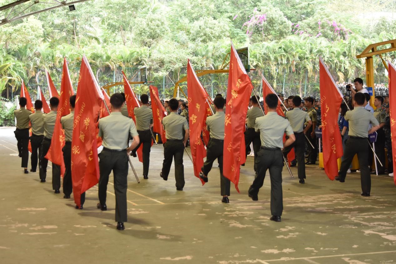 伴着《中华人民共和国国歌》,教官们的脚步声变得更加有力,声音更加洪亮。在激昂的歌声中感受军人的精神,展开了此次的军训动员大会。