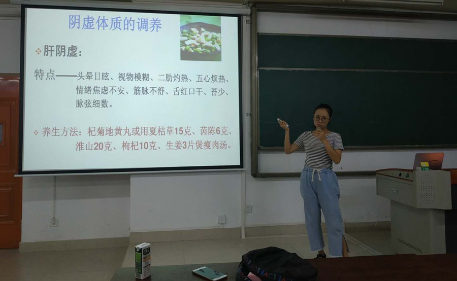 第二个上场的是工作室成员梁海燕同学,她分享的内容是:中医体质辨识与药膳应对相关内容。这次例会她着重介绍了阳虚体质与阴虚体质,通过小测试进行自我测试,来判断自身的属性。