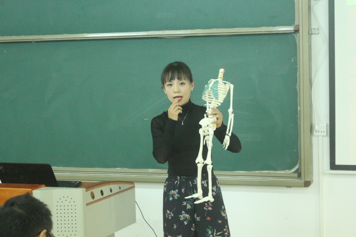 许筱老师一上台就亮出了她珍爱的“小白”——人体骨架模型,并借此引出她要讲解的“肌肉的结构与工作”。她从肌肉的形态、大小、位置、作用以及方向对肌肉进行分类讲解,让大家清楚的了解到身体各个部位的肌肉都有自己的名字以及作用,让大家更加清楚自己身体的构造。