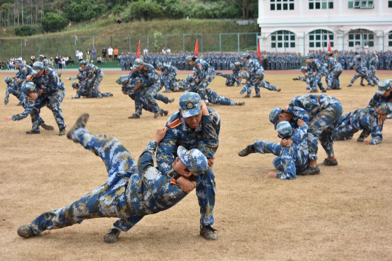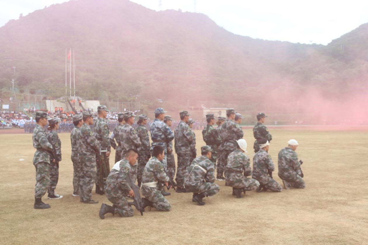 礼仪队分别带领所站的公司依次入场就席而坐,军训中除标兵队汇演之外还有战地应急救护、应急棍、擒敌术、真人CS、防火演练、匍匐前行等诸多项目,下列则是这些队伍的汇报表演,让在座的嘉宾及同学看到了无不为之喝彩,为之震撼。