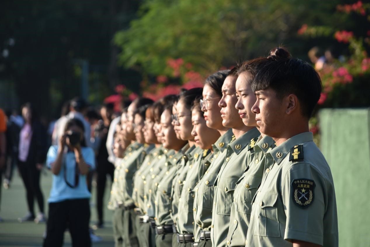 紧张严肃的分列式汇报表演结束后,即响起了国歌的旋律,无论是在军训队伍中的一员还是以观众身份到场的嘉宾,他们都肃然起敬,目光如炬,朝着国旗升起的方向肃然起敬,直到国歌歌声结束后操场再次沸腾起来。