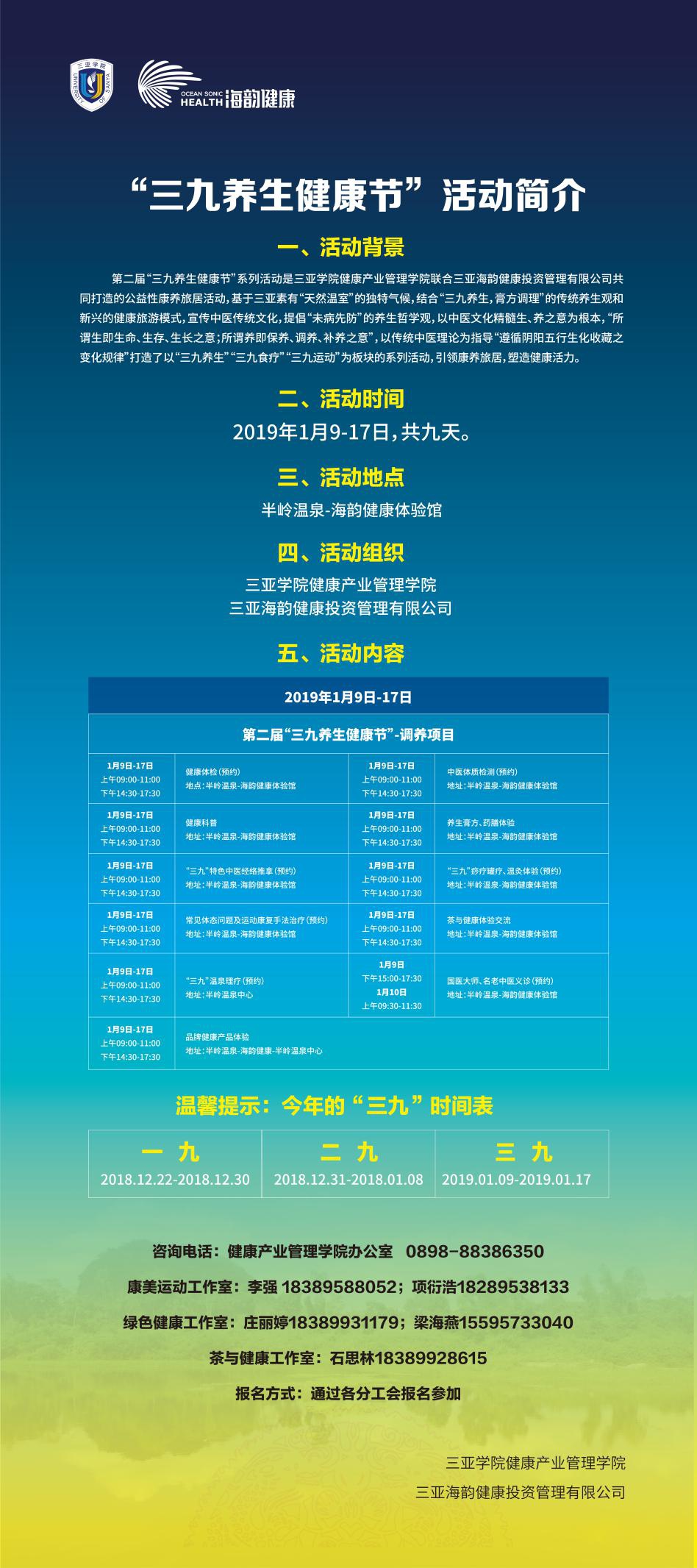 1月9日08:00,书山馆大报告厅,举办第二届中国(三亚)健康产业创新发展论坛暨“三九养生健康节”开幕式及主题报告会。