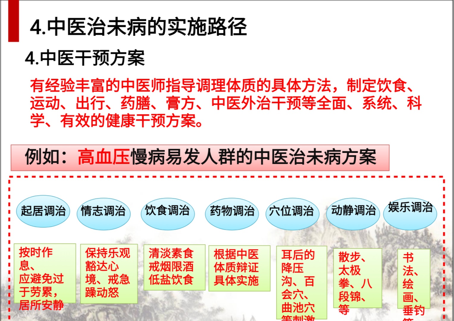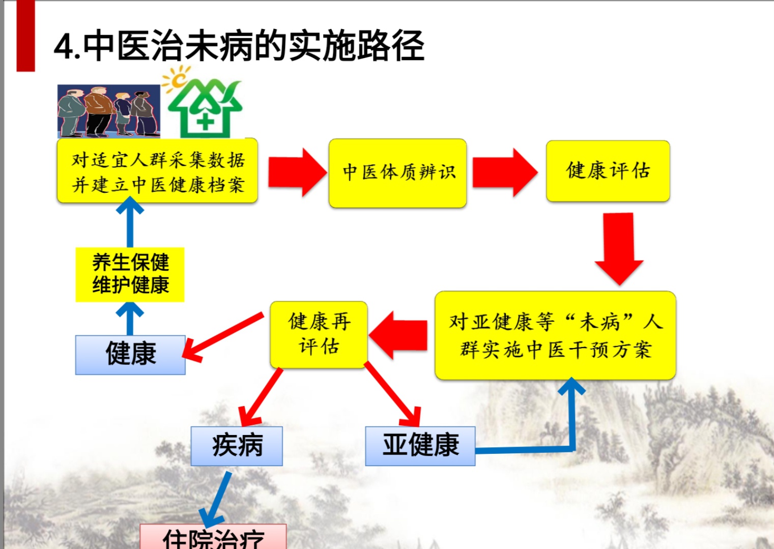 通过对适宜人群采集数据并建立中医健康档案、中医体质辨识、健康评估、中医干预方案,健康再评估构成了中医治未病的实施路径。