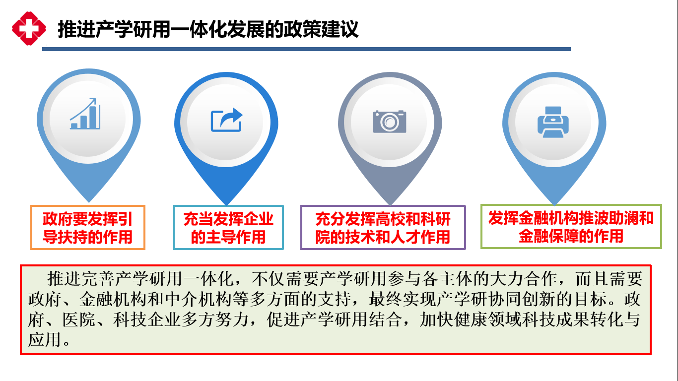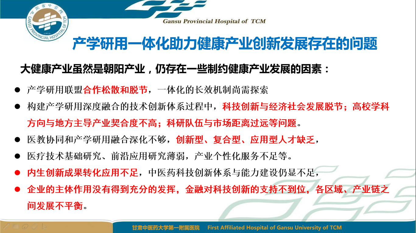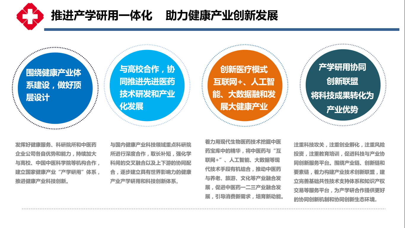 “产学研用的融合,产是指企业,学是大学,研是科研院所”。李盛华教授指出各自发挥优势形成强大的研究、开发、生产、应用一体化的先进系统。产学研用是科研、教育生产、市场不同社会分工在功能与资源优势上的高度协同与集成化,是科技与产业的无缝对接,有利于国家高新技术产业和整个国民经济发展。同时李盛华教授提到“习近平总书记去年7月13日召开中央财经委员会第二次会议上强调,要推进产学研用一体化,支持龙头企业整合科研院所、高等院校的力量,创建新联合体。李克强总理也在政府工作报告中提出,鼓励大企业、高校和科研院所开放创新资源,发展平台经济、共享经济形成线上线下的结合、产学研用,打造双创的升级版”。产学研用多方协同,多元合作提供“世界方案”,以产为依托,企业发挥主体作用。李盛华讲到的主要是在讨论大健康这个话题。大健康是我们国家近些年来提出的,特别是习总书记在十九大报告中专门讲了大健康的理念。