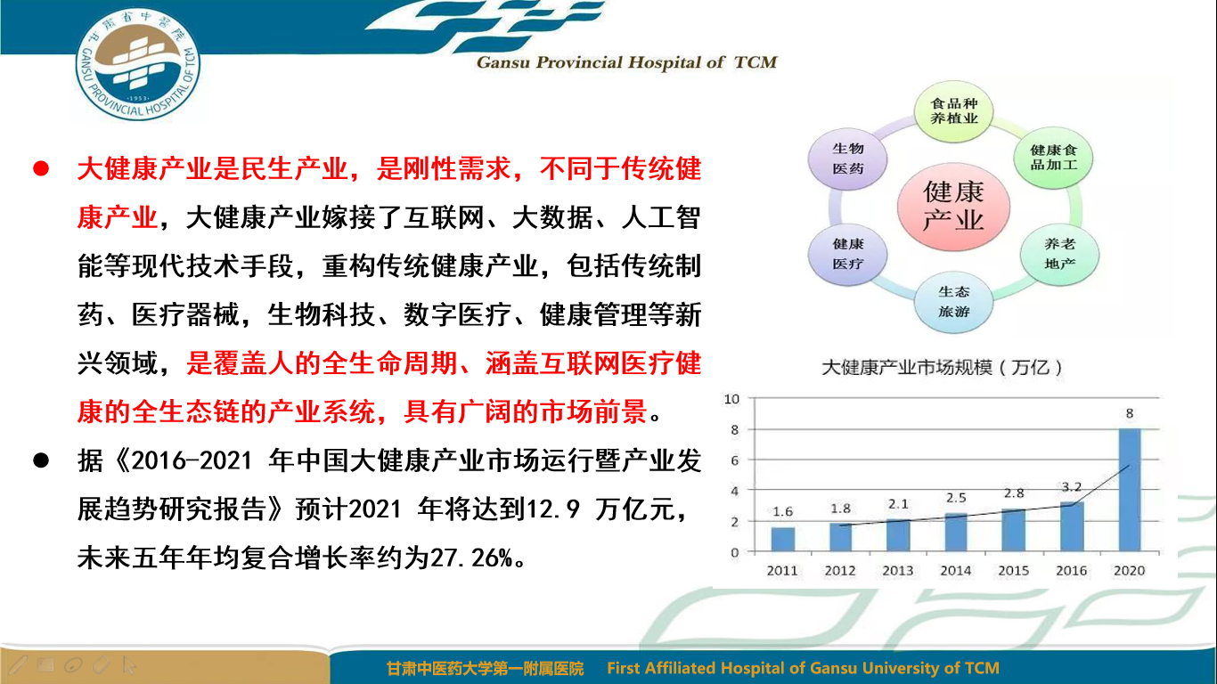 大健康产业是民生产业,是刚性需求,不同于传统健康产业,大健康产业嫁接了互联网、大数据、人工智能等现代技术手段,重构传统健康产业,包括传统制药、医疗器械,生物科技、数字医疗、健康管理等新兴领域,是覆盖人的全生命周期、涵盖互联网医疗健康的全生态链的产业系统,具有广阔的市场前景。