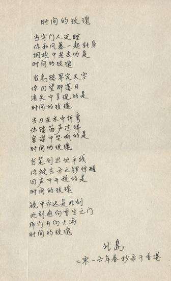 穿插在诗歌解读的字句间,北岛为我们记述了每位诗人的生平,这使得《时间的玫瑰》的文本体式变得富厚而复杂,难以归纳界定。书中那些北岛热爱的诗人,大多一生历经劫难,命运多舛。我原想此为北岛选择侧重点之一。然北岛告知,他之所以挑选这九位诗人,纯粹是出于对他们诗歌的喜爱。很多关于他们生命的故事,还是在为写作做功课期间,阅读各种版本的诗人传记时才得知的。这使我想到北岛谈论曼德尔施塔姆时所指说的:“一个有使命感的人是要多少受苦的,必然要与外在命运抗争,并引导外在命运。”——如此的性格成就如此的诗歌;如此的性格导致如此的命运,果真成败皆萧何。北岛的气质该是与他们相通的,若莫如此,“热爱”无可凭生。