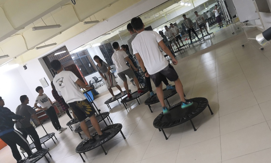 蹦床团操课过程中需要练习者能够摒弃一切杂念,全身心投入激情的运动之中,并且通过不少伸展全身的动作,能够有效帮助消除紧张、疲劳感。