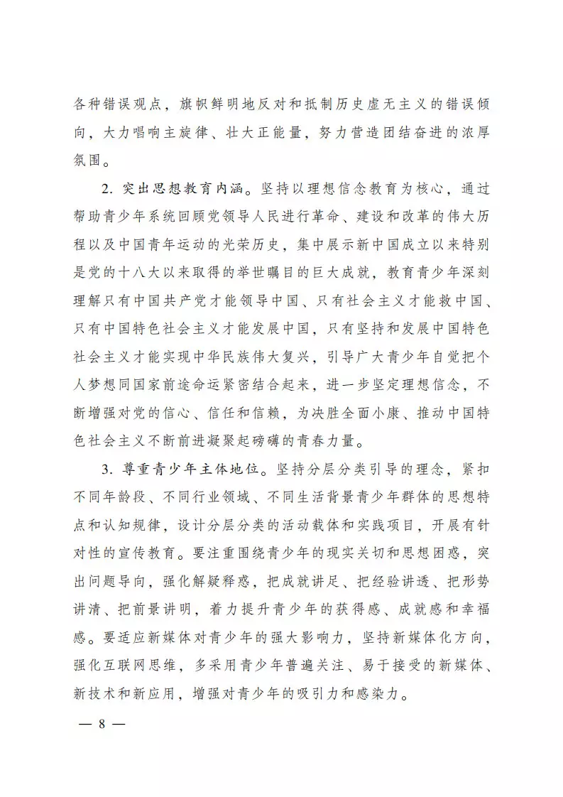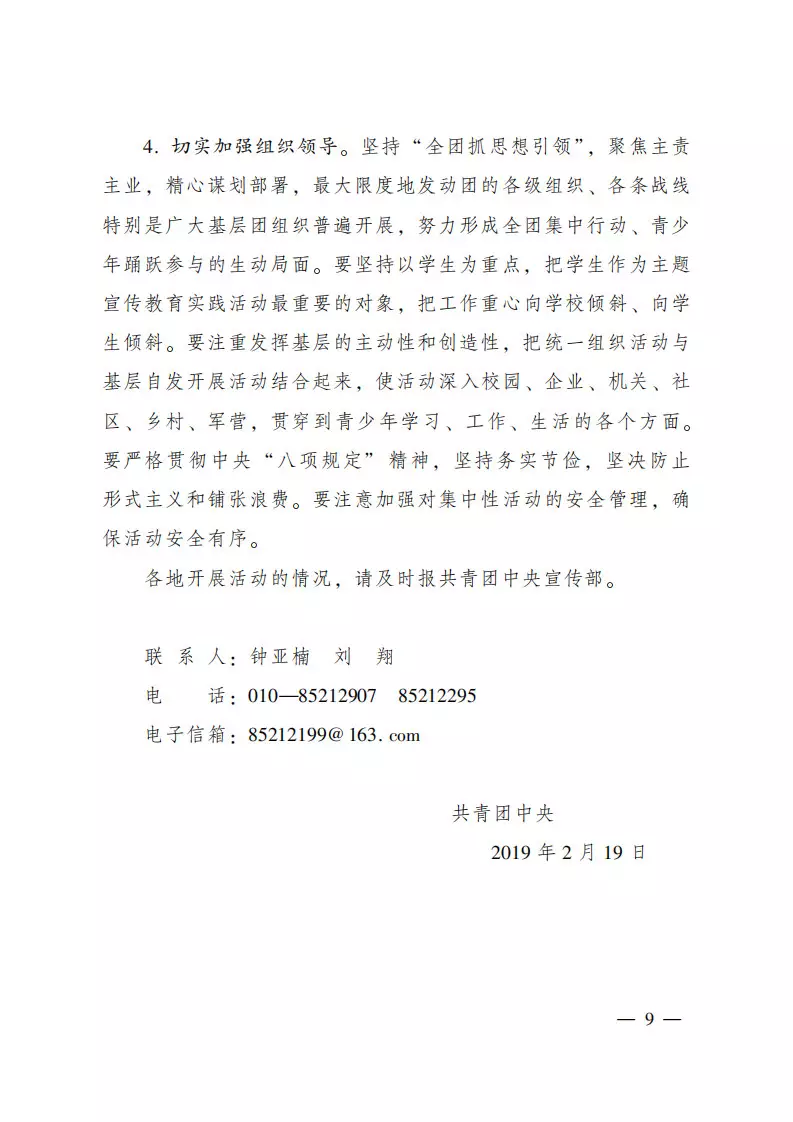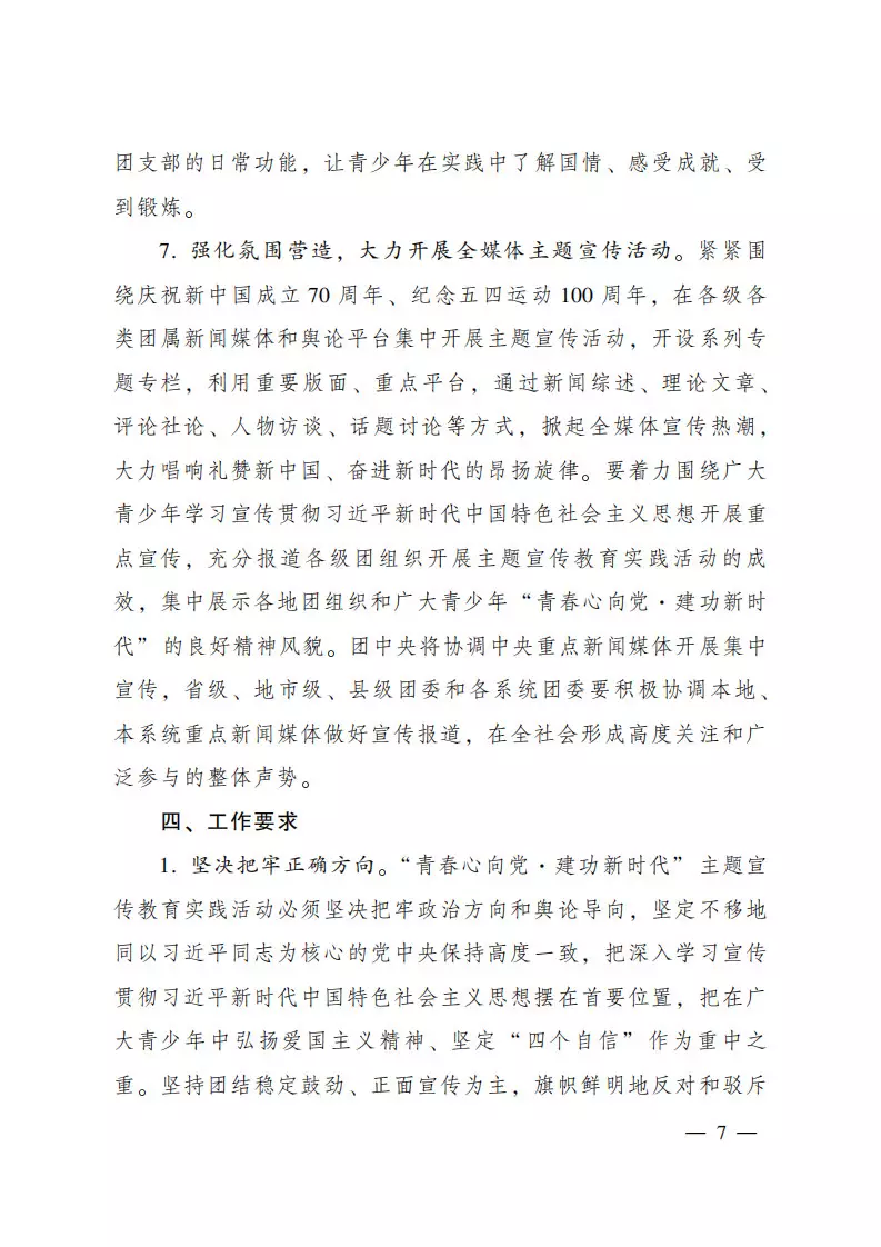 通知强调,要坚决把牢政治方向和舆论导向,坚定不移地同以习近平总书记为核心的党中央保持高度一致,把深入学习宣传贯彻习近平新时代中国特色社会主义思想摆在首要位置,把在广大青少年中弘扬爱国主义精神、坚定“四个自信”作为重中之重。要突出思想教育内涵,坚持以理想信念教育为核心,引导广大青少年自觉把个人梦想同国家前途命运紧密结合起来,不断增强对党的信心、信任和信赖。要尊重青少年主体地位,坚持分层分类引导的理念,紧扣不同青少年群体的思想特点和认知规律,设计具体活动载体和实践项目,开展有针对性的宣传教育。要切实加强组织领导,坚持“全团抓思想引领”,最大限度地发动团的各级组织、各条战线特别是广大基层团组织普遍开展,努力形成全团集中行动、青少年踊跃参与的生动局面。