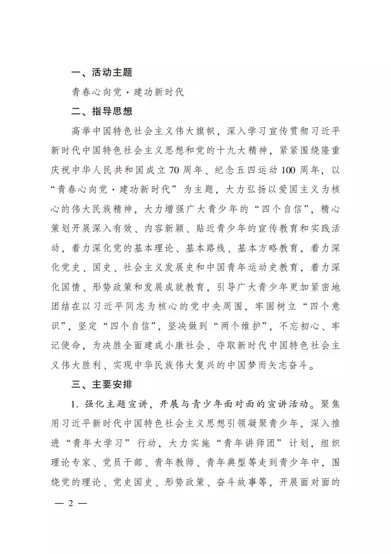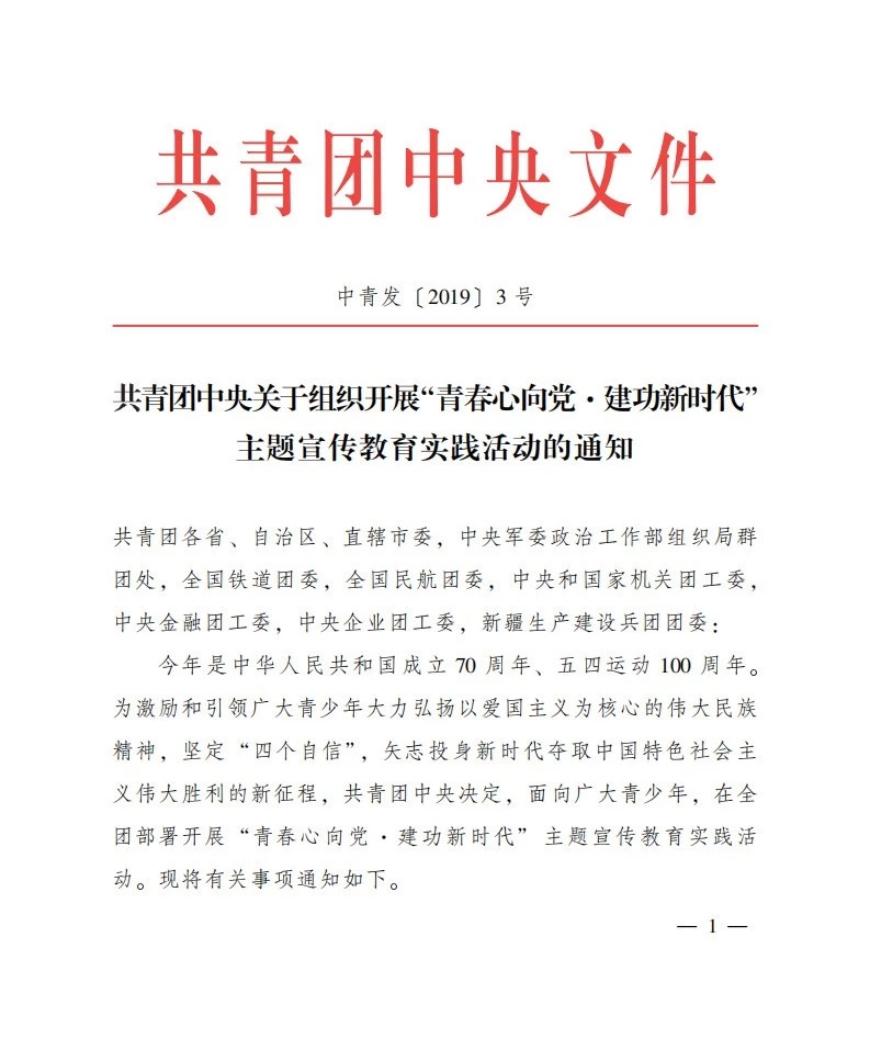 共青团中央日前发出通知,围绕庆祝中华人民共和国成立70周年、纪念五四运动100周年,在全团部署开展“青春心向党·建功新时代”主题宣传教育实践活动,激励和引导广大青少年大力弘扬爱国主义精神,矢志投身决胜全面建成小康社会、夺取新时代中国特色社会主义伟大胜利的新征程。