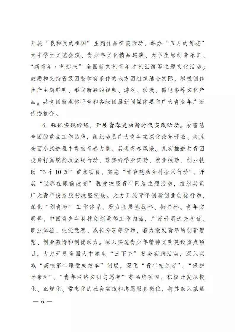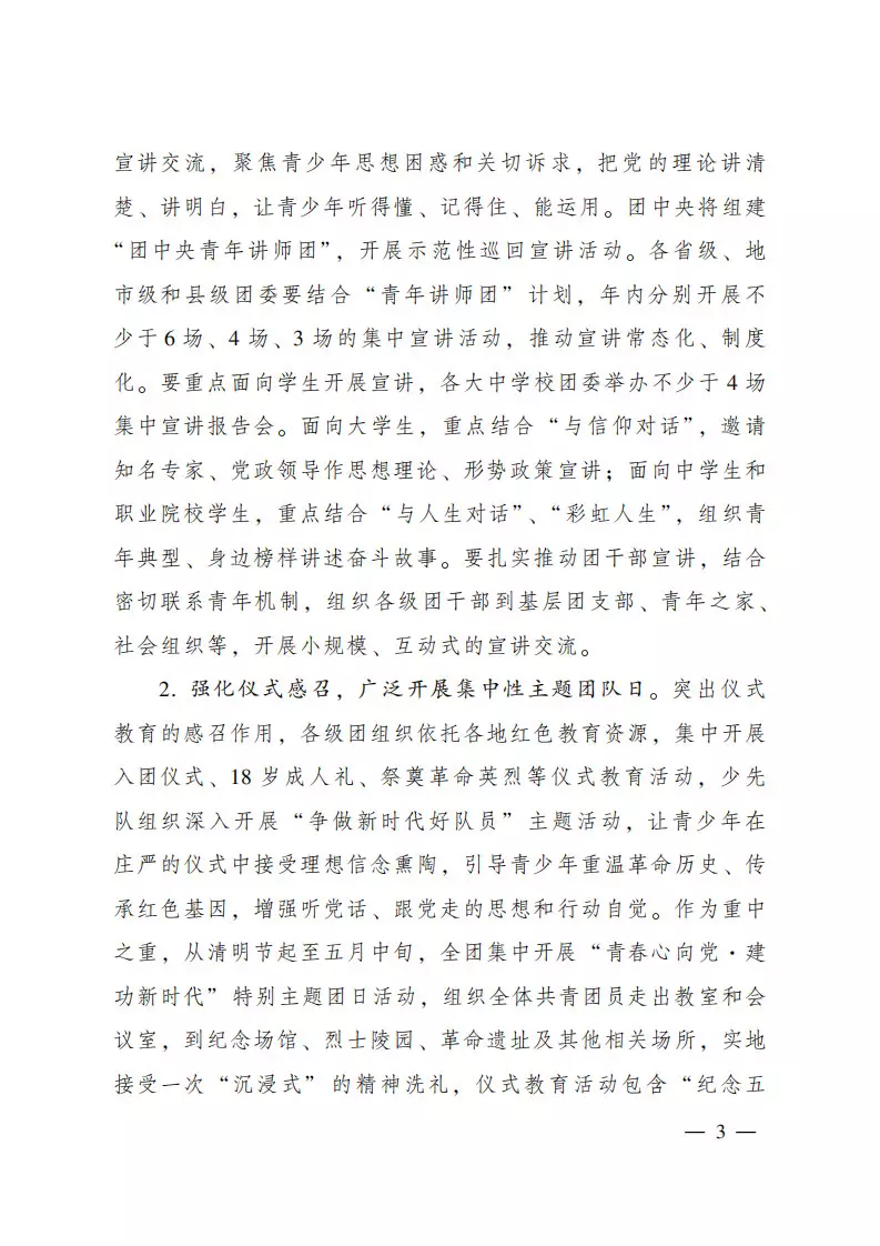 要广泛开展集中性主题团队日,突出仪式教育的感召作用,依托各地红色教育资源,集中开展入团仪式、18岁成人礼、祭奠革命英烈等仪式教育活动,组织全体共青团员实地接受一次“沉浸式”的精神洗礼。