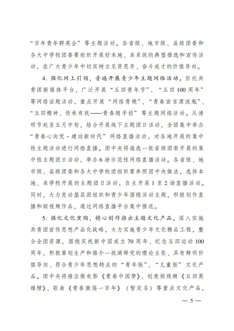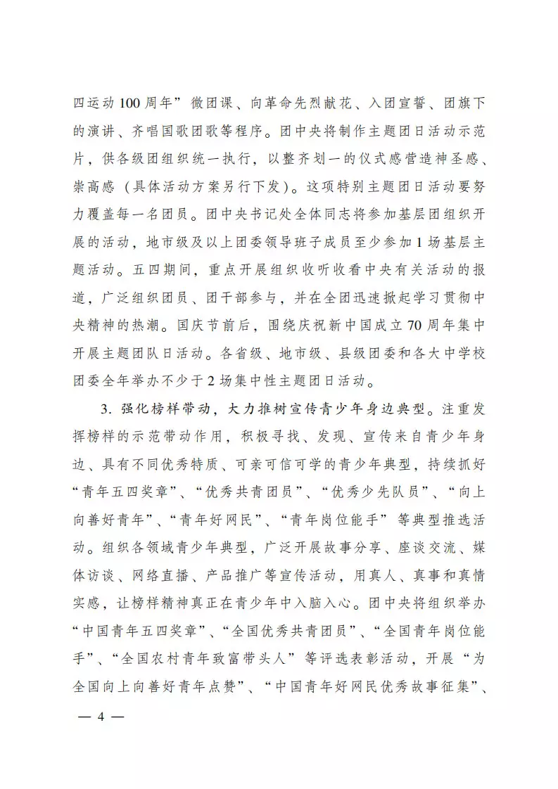 要大力推树宣传青少年身边典型,持续抓好“青年五四奖章”“优秀少先队员”“向上向善好青年”等典型推选活动。要普遍开展青少年主题网络活动,广泛开展“五四青年节”“五四100周年”等网络话题活动,结合线下主题团日活动,集中举办网络直播活动。要大力实施青少年文化精品工程,积极策划生产和推介一批阐释党的理论主张、具有鲜明价值导向、符合青少年思想特点的“青年版”“儿童版”文化产品。要开展青春建功新时代实践活动,紧密结合团的重点工作品牌,组织动员广大青年在深化改革开放、决胜全面小康进程中贡献青春力量。要大力开展全媒体主题宣传活动,充分报道各级团组织开展主题宣传教育实践活动的成效,集中展示各地团组织和广大青少年的良好精神风貌。