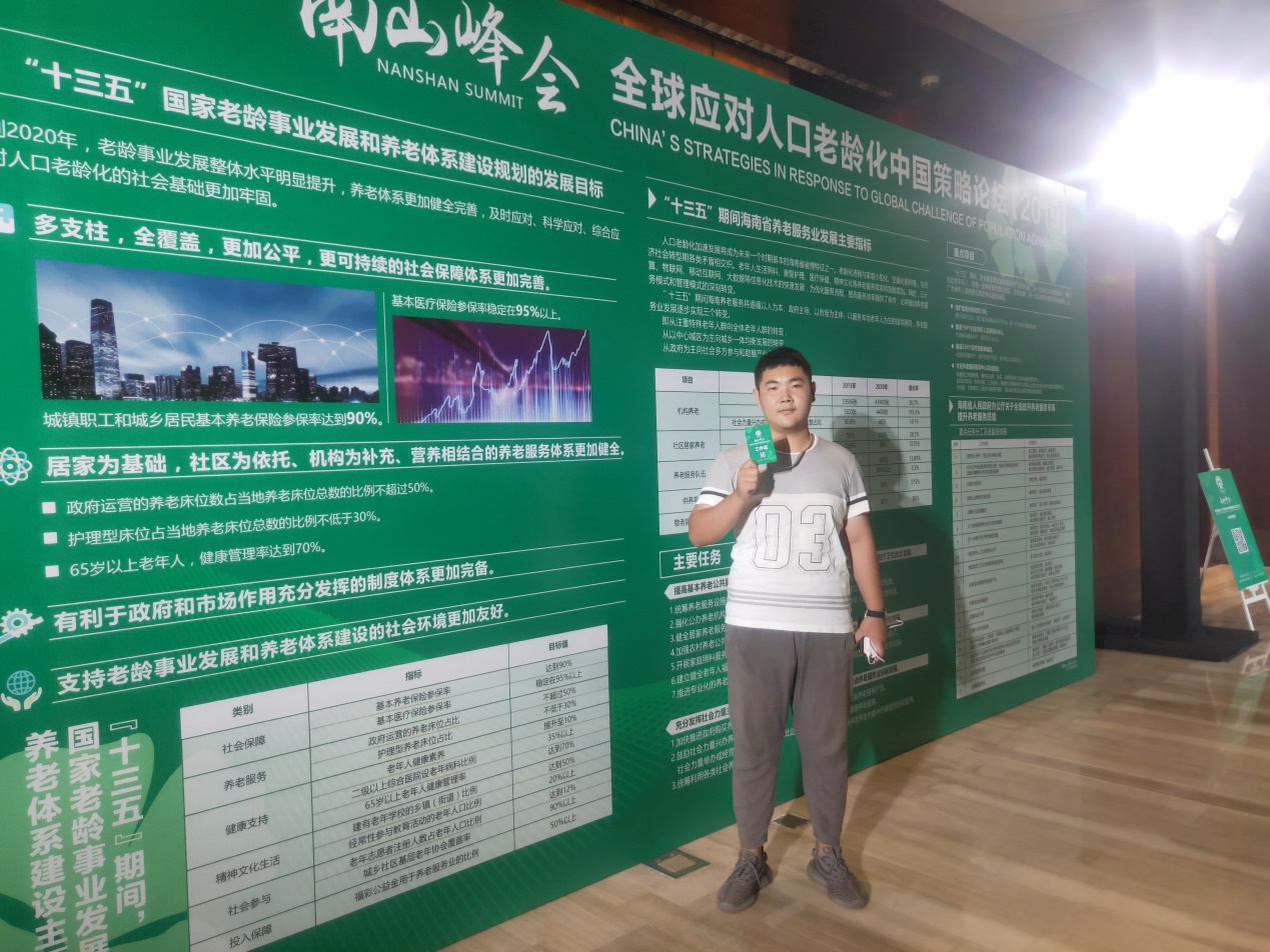 2019年4月13日至4月14日期间第二届南山峰会暨全球应对人口老龄化中国策略论坛【2019】在在美丽的“东方夏威夷”海南省三亚市海棠湾9号度假酒店隆重召开。我作为一名中宾管家的志愿者,参加此次南山峰会受益颇深,给予我很多感悟,也从中学习到了很多知识。在岗位上,我认真负责,努力协助主办方完成大会工作任务,与工作负责人及其他同学相互配合、相互协调完成此次南山峰会。本次大会,从“创新康养模式,助力健康老龄化”这一主题出发,从积极老龄化谈到健康产业,从医养结合谈到护理保障。打开了新世界的大门,让我对老龄化有了新的认识,收获了宝贵的经验。