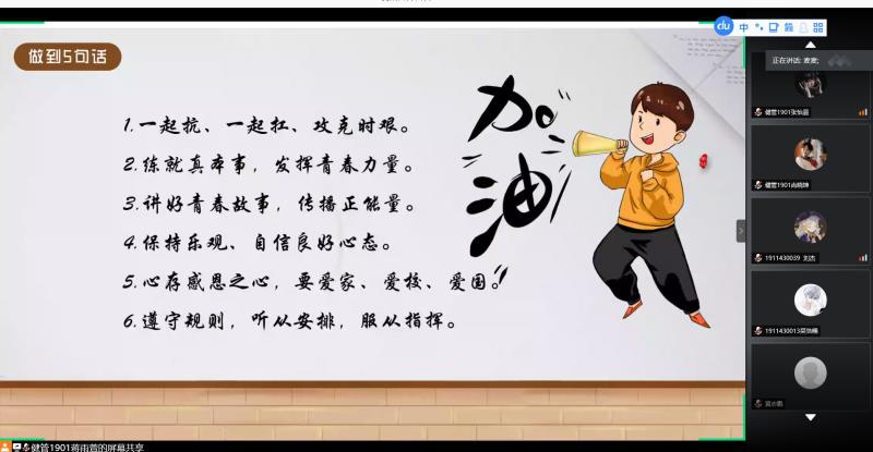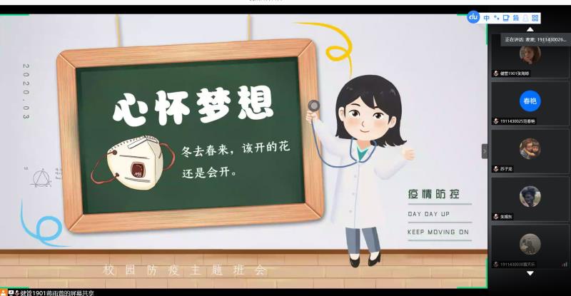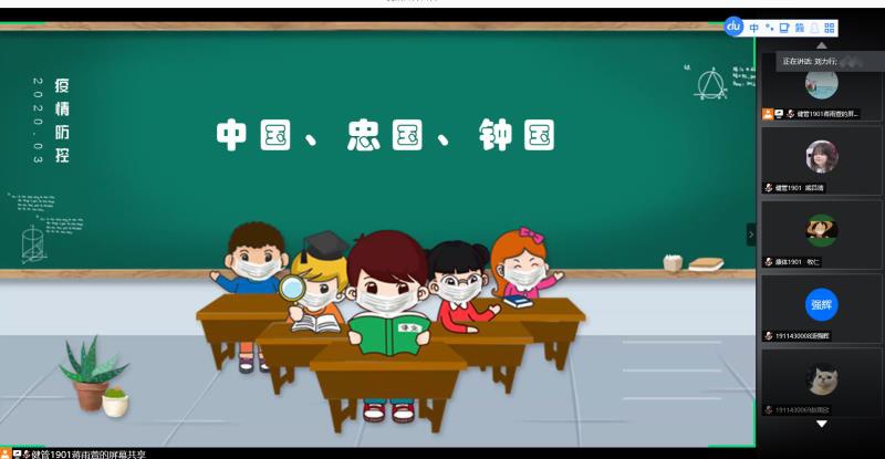 思想导师张秀平主持17、18级主题班会,思想导师王璐婷主持19级主题班会,她们就“我为自贸港建设做贡献、我为疫情防控献力量”为主题展开。17、18级思想导师张秀平首先向同学们分享了五个词(舍我其谁、风雨同舟、竭尽全力、心怀梦想、行成于思),这五个词涵盖了新冠疫情下各行各业人的担当和使命,张老师希望同学们能够透过这五个词能有所触动和思考。其次,张老师借助6句话向同学们讲述,青年老员工该如何为海南自贸港建设,如何为疫情防控做贡献。最后,张老师说到无论是员工还是老师都该把“中国、忠国、钟国”牢记于心,热爱我们的国家。