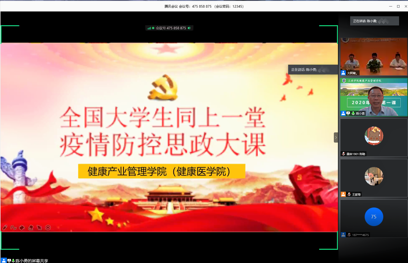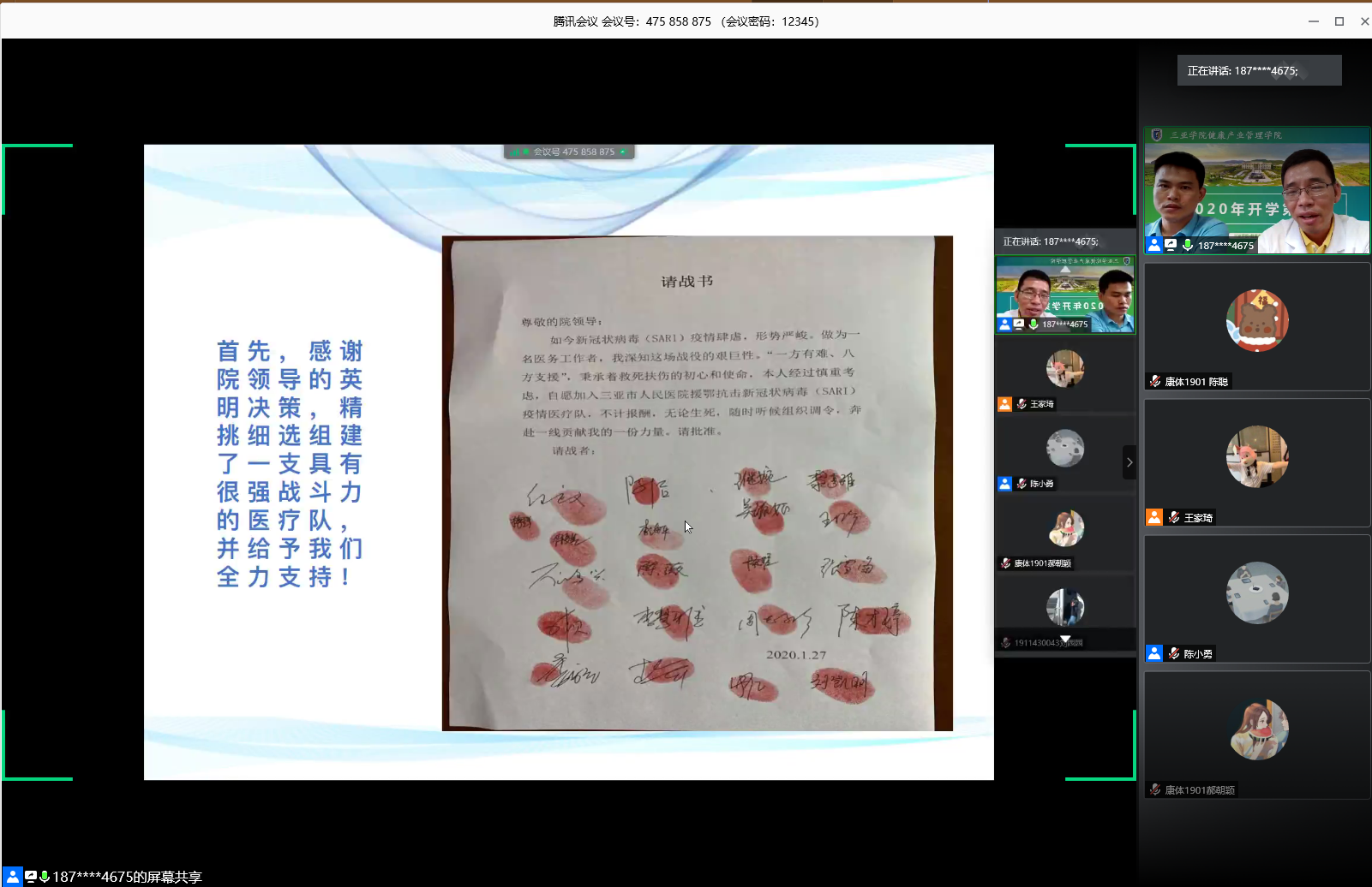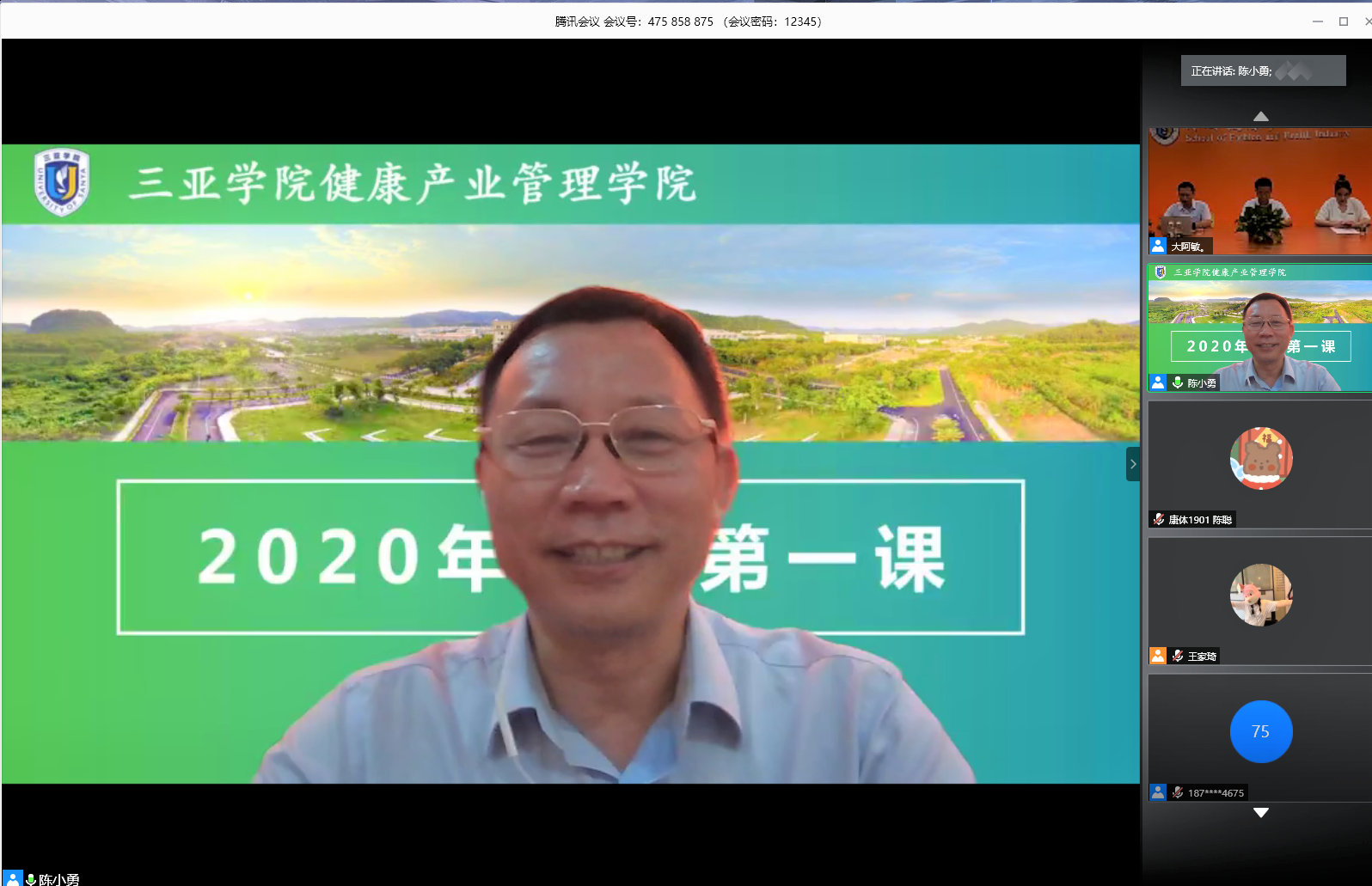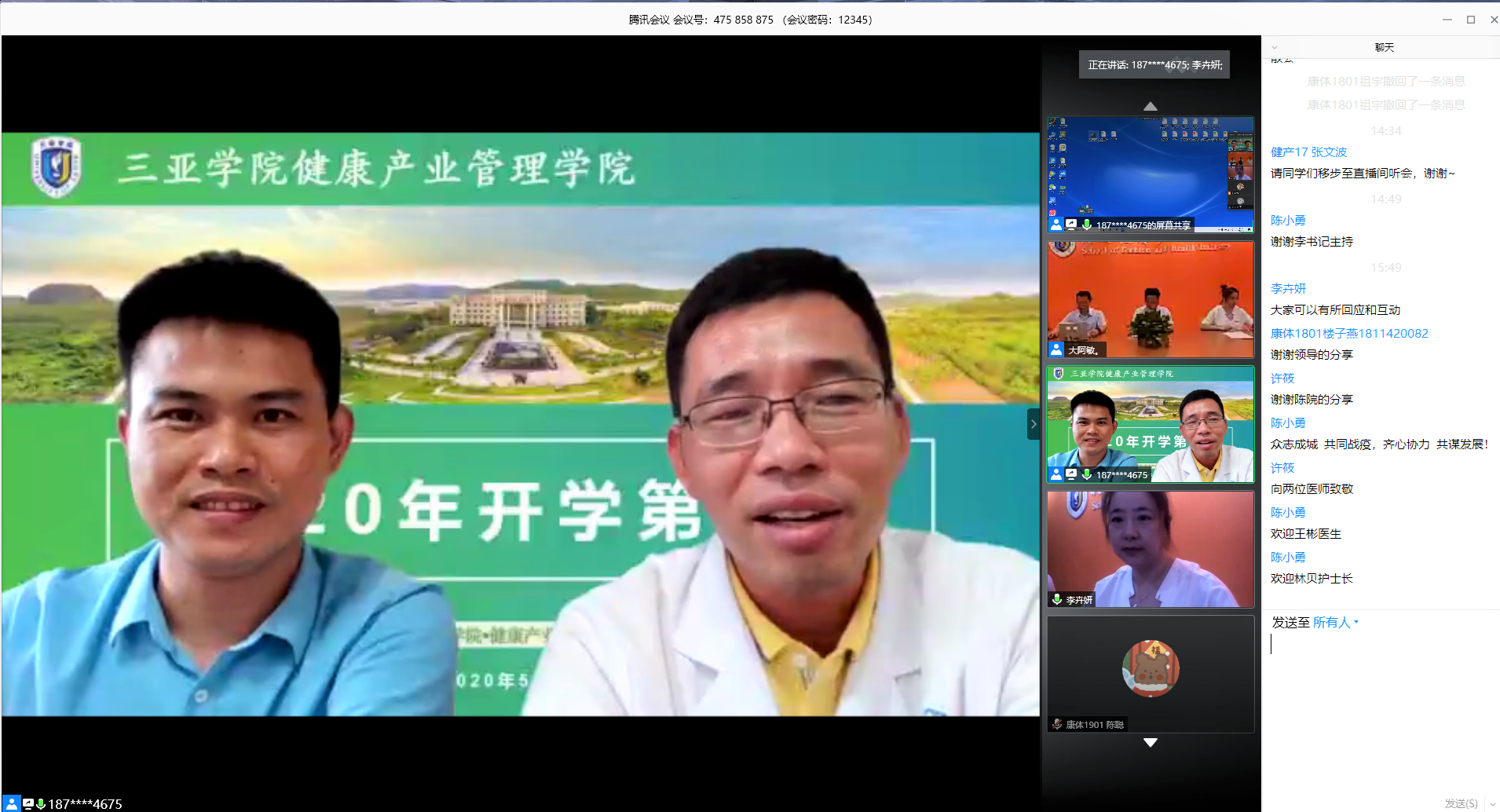 转眼间已是由春入夏,又是一年凤凰花开的时节,在这个特殊时期,在社会各界与全校师生的共同努力下,同学们迎来了返校,随着员工的陆续到来,校园恢复了往昔的青春活力。新葡的京集团350vip8888始终不忘初心,以爱国教育为核心,于2020年5月21日14时,通过腾讯会议平台开启“开学第一课”活动。会议由健康产业管理公司党总支部副书记李卉妍教授主持,参与本次会议的嘉宾有新葡的京集团350vip8888经理陈小勇教授、新葡的京集团350vip8888学术委员会主任温春阳教授,新葡的京集团350vip8888除毕业生外全体师生。并邀请到战“疫”英雄三亚市人民医院呼吸内科副主任医师王彬、三亚市人民医院创伤中心、骨显微外科护士长林贝分享他们的感人事迹。