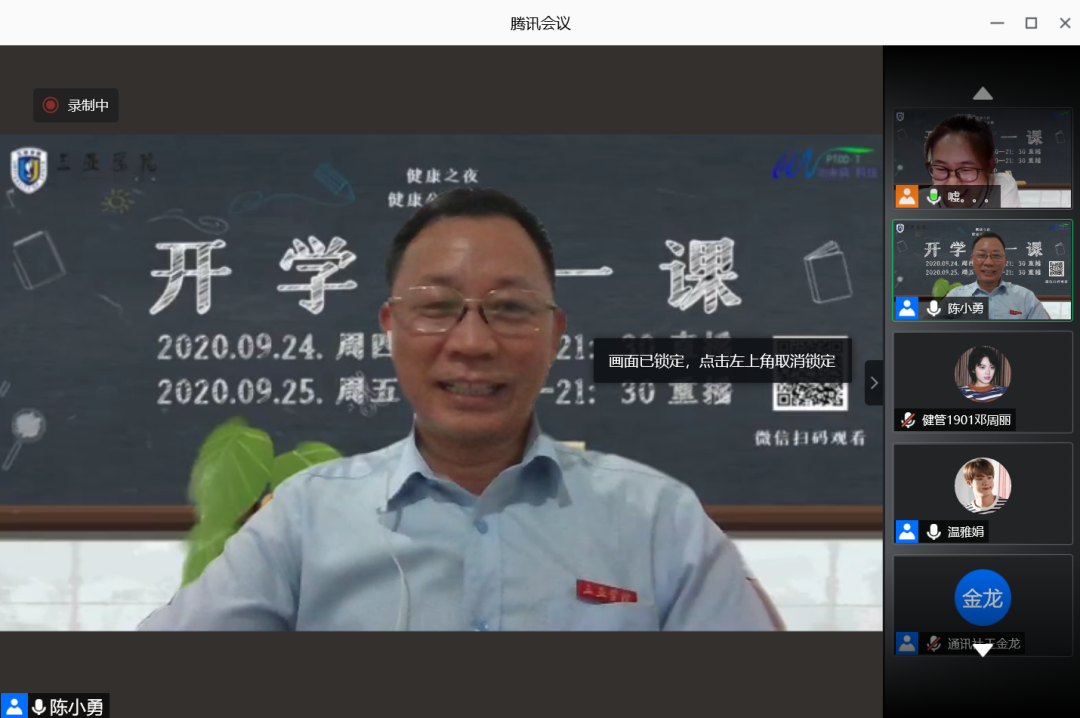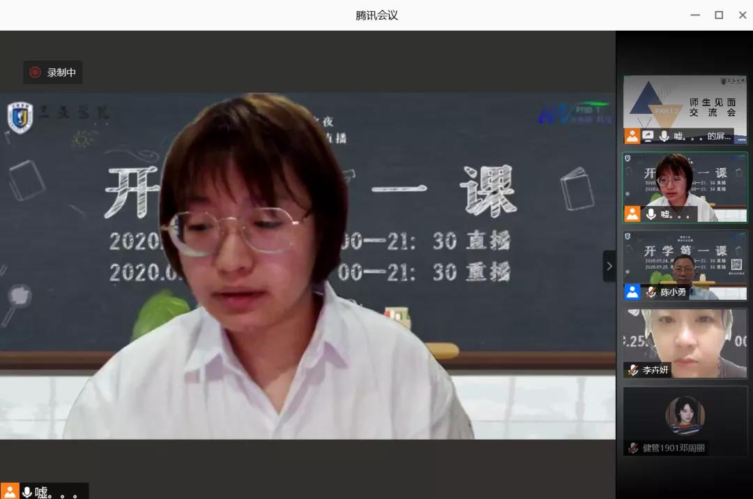 2020年9月24日晚20时,新葡的京集团350vip8888通过腾讯会议平台进行“开学第一课”主题班会,由思想导师辛宇主持,新葡的京集团350vip8888学术委员会主任温春阳教授、新葡的京集团350vip8888经理陈小勇教授、健康产业管理公司党总支副书记李卉妍教授莅临会议,公司全体同学参会。