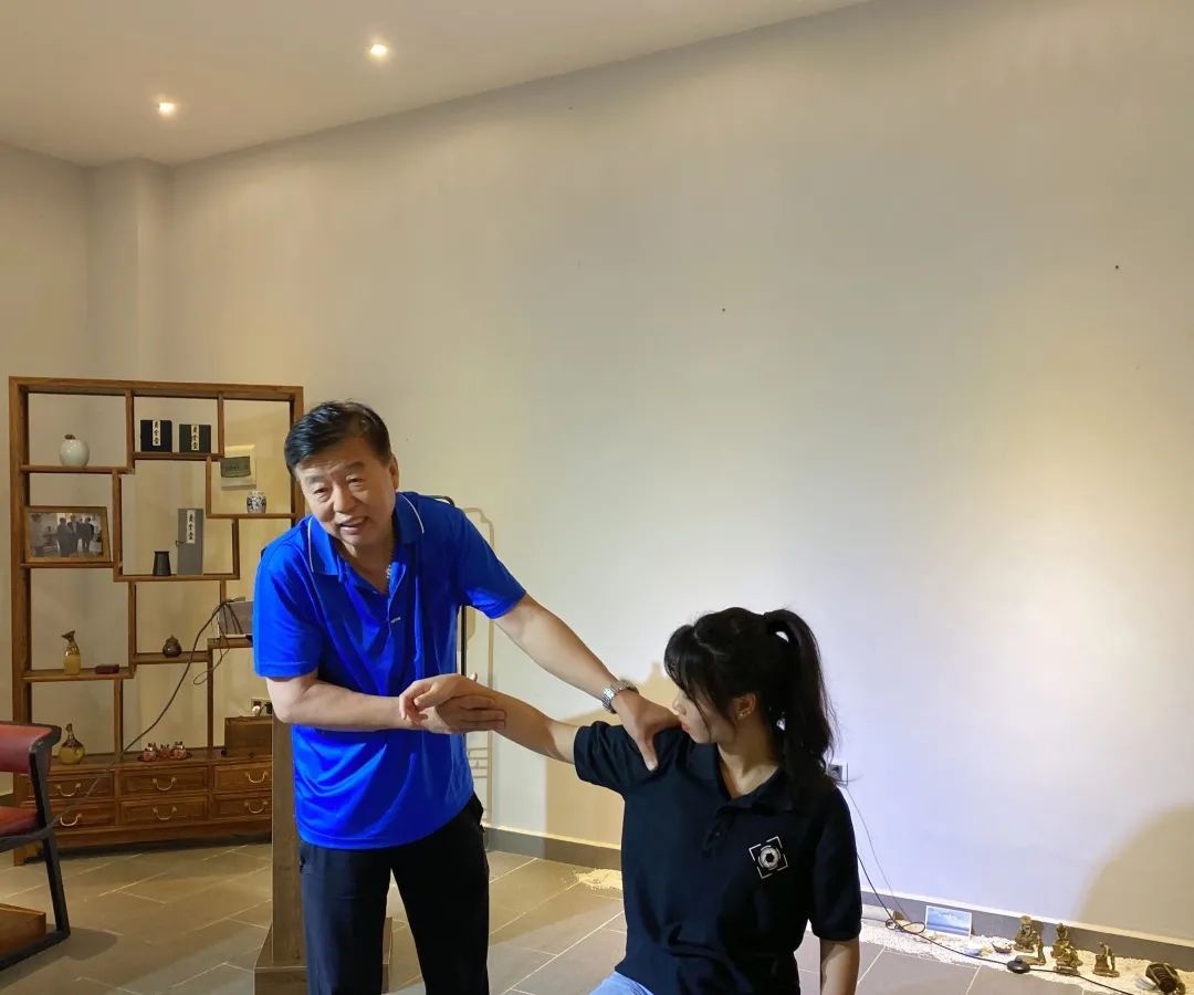 大会内容的第三项,由杨济教授展示巧治肩周炎的手法操作。肩周炎是五十多岁左右中老年人的常患疾病,因肩部外伤,受凉,退行性改变等原因造成肩关节粘连,引发疼痛和功能障碍。而如何巧治肩周炎呢?接下来杨济教授亲身为我们介绍展示治疗手法。治疗手法有:1、放松肌肉。用指柔法在肩关节周围压痛点做分筋和拔筋手法2、掌根柔法。双掌根对向按在肩前后侧,靠手腕摆动推揉肉五分钟。3、扣击法。同样部位,用掌根扣击一分钟。
