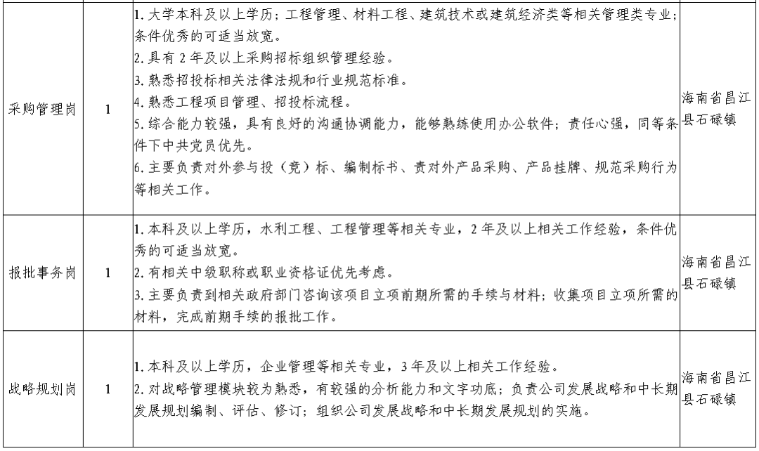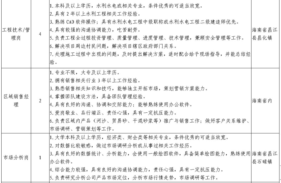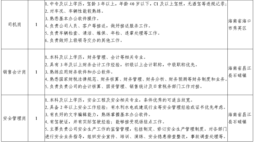 (一)聘用人员年薪8万-11万,工资月均5000-8000元/人。周末双休(周末车辆往返海口昌江)、昌江地区食宿、带薪培训、团队拓展、五险一金、多渠道晋升调薪、带薪假期(年假、婚丧假、产假、探亲假等)、月度绩效、年度绩效、高温津贴、安全奖、学历津贴、职称津贴等。(二)有意竞聘者请将简历投递至我公司邮箱hnhdzp@hnhggp.com (邮件标题请注明“姓名+应聘岗位”),请确认工作地点,如无法接受,请勿投递。经资格审查后,符合条件人员将以电话或短信形式通知,未入围者不再另行通知。2021年2月26日、3月11日、3月22日、3月29日,具体时间地点将以电话、微信、信息等形式通知。公司地址:海南省昌江县石碌镇环城西一路海钢八达城7号