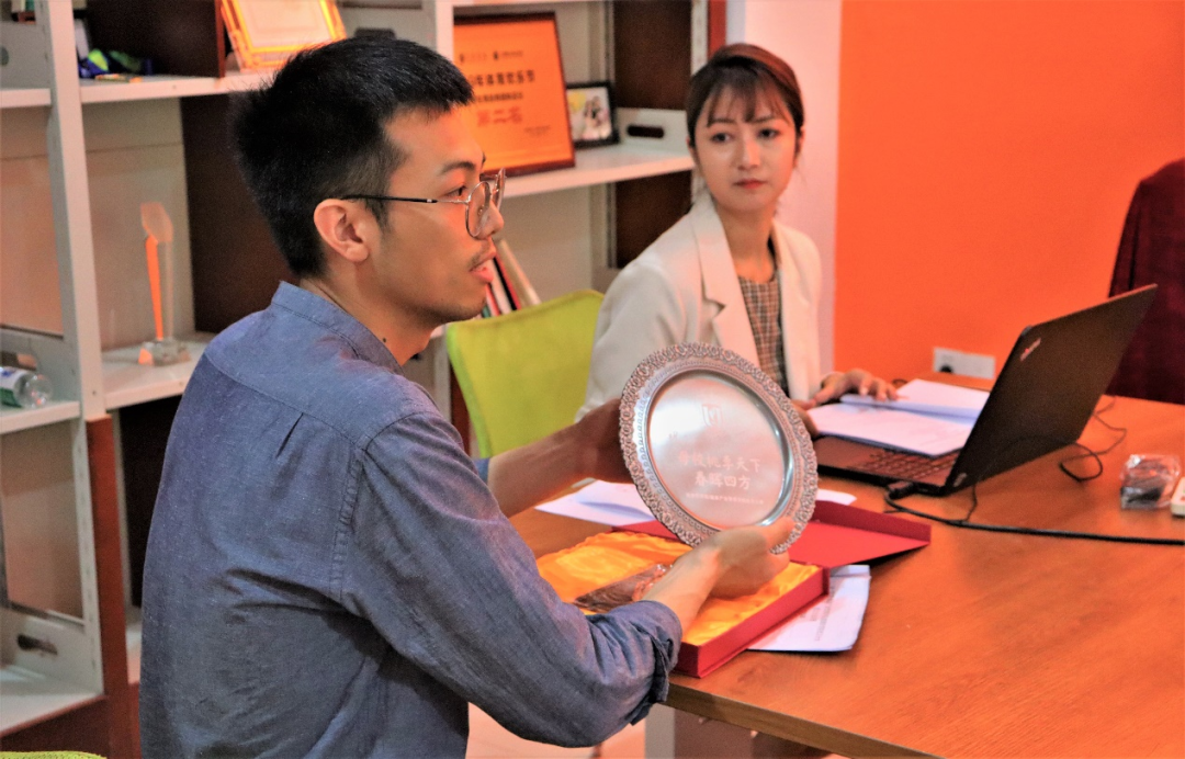 (员工王祎宁在展示纪念品)