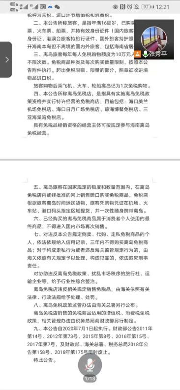 首先张秀平老师就《关于海南离岛旅客免税购物政策的公告》进行了全面传达和解读,特别强调了:已经购买的离岛免税商品属于消费者个人使用的最终商品,不得进入国内市场再次销售。对违反本公告规定倒卖、代购、走私免税商品的个人,依法依规纳入信用记录,三年内不得购买离岛免税商品;对于构成走私行为或者违反海关监管规定行为的,由海关依照有关规定予以处理,构成犯罪的,依法追究刑事责任。
