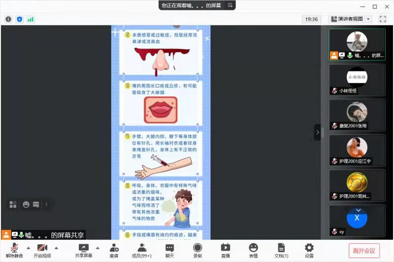 2021年7月11日,新葡的京集团350vip8888护理学专业开展“无毒人生”主题班会。这次班会通过线上会议的方式,思想导师辛宇老师主持,护理学专业共计130人参加。会议提及了禁毒方面的知识,让同学们更加深入了解了禁毒知识。