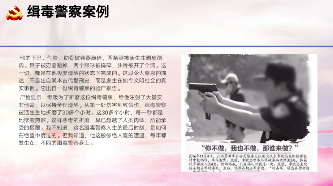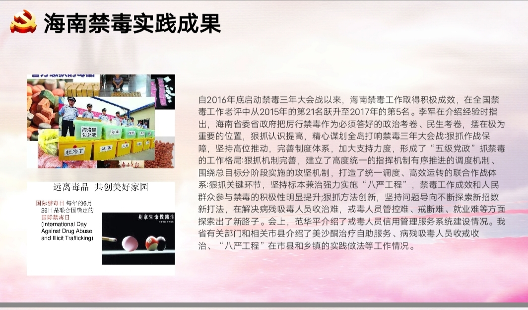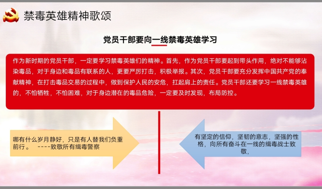 首先张秀平老师全面禁毒宣传。分别从毒品的危害、海南禁毒成果、缉毒警察案例以及作文党员同志该如何进行了解几方面向同学们进行了宣传,并且通过播放视频的方式是禁毒宣传达到更好的效果。