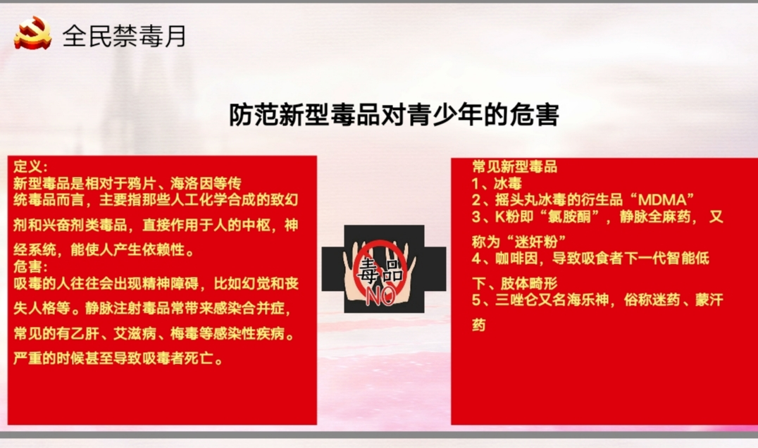 通过本次会议,同学们全面的了解了全民禁毒的重要性以及党成长的历程,提高了思想觉悟,加强了同学们的思想道德建设。