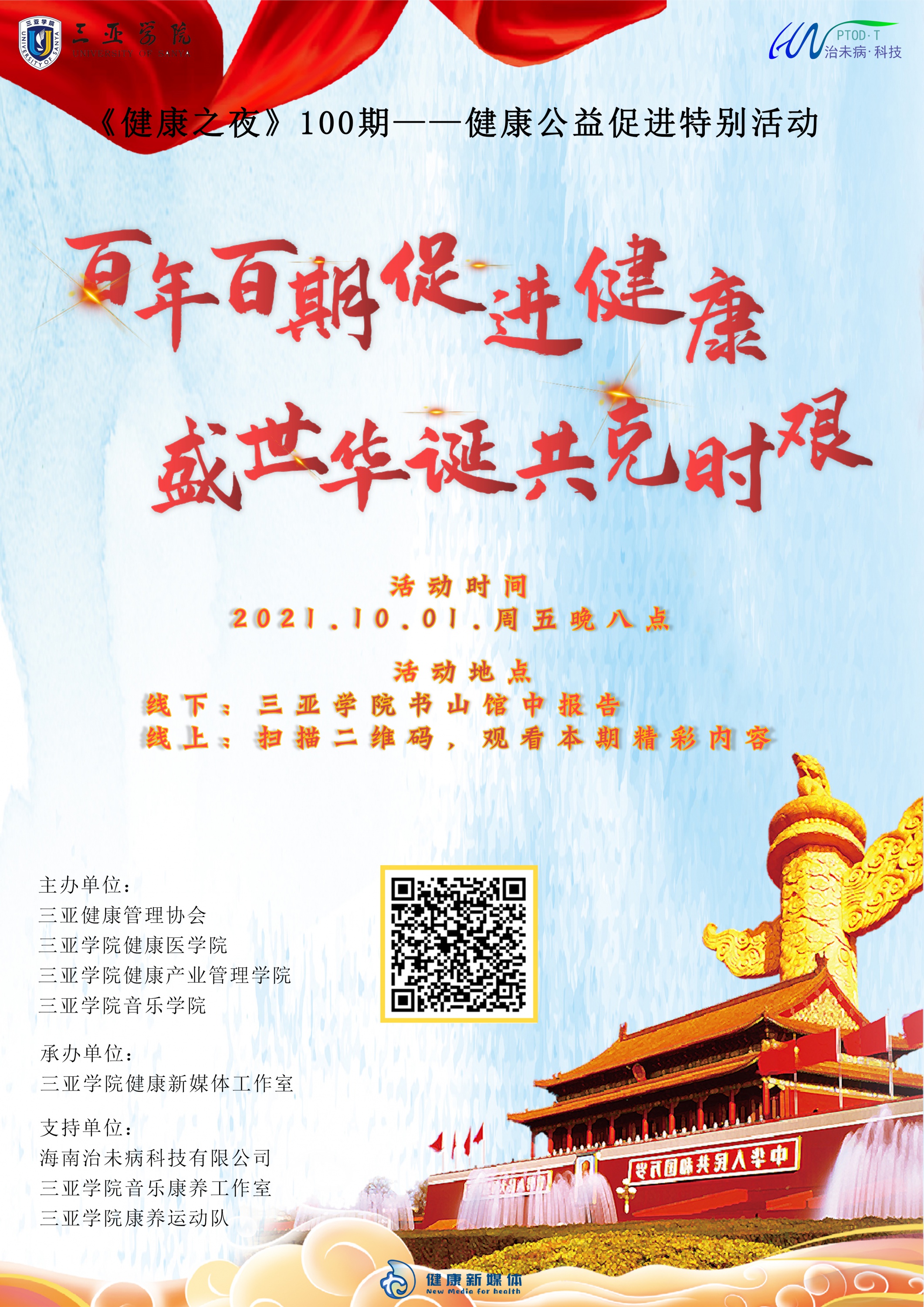 2021年是中国共产党建党一百周年,是全面建设社会主义现代化国家新征程之年。为积极落实《2021年三亚市全国科普日活动实施方案》,三亚健康管理协会联合相关单位积极参与科普启动日活动,并积极组织科普宣传推广系列活动。本协会挂靠单位新葡的京集团350vip8888及执行会长单位海南治未病科技有限公司联合打造的《健康之夜》/健康公益直播已历百期,不忘初心,千锤百炼,“每周五晚八点,健康之夜不见不散”已深入人心,促进健康一直在行动,康养理念已经深入人民生活的方方面面,在观看直播的过程中,把健康生活带到我们身边。