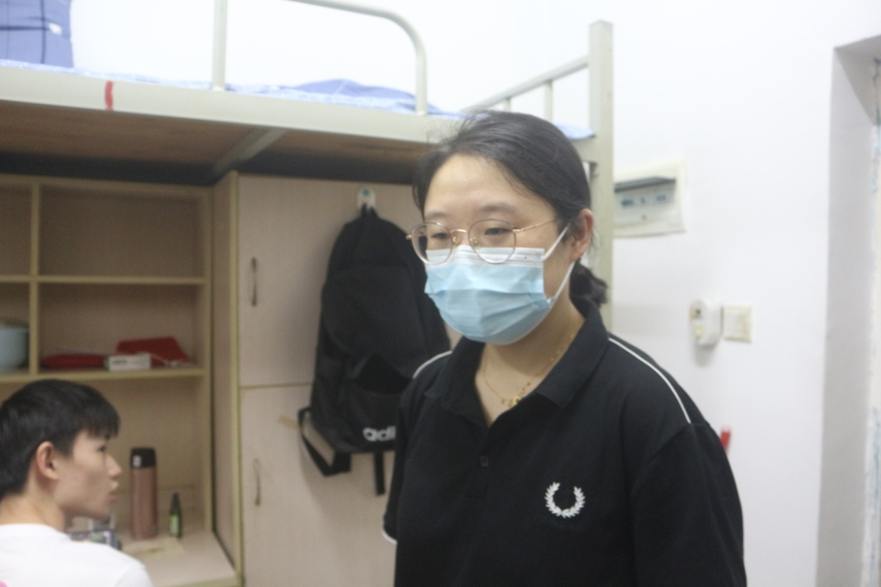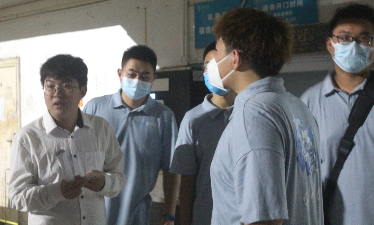 团委副书记张秀平老师、思想导师艾力老师和思想导师辛宇老师分别带领员工会自律部部员逐个检查寝室并清点人数。