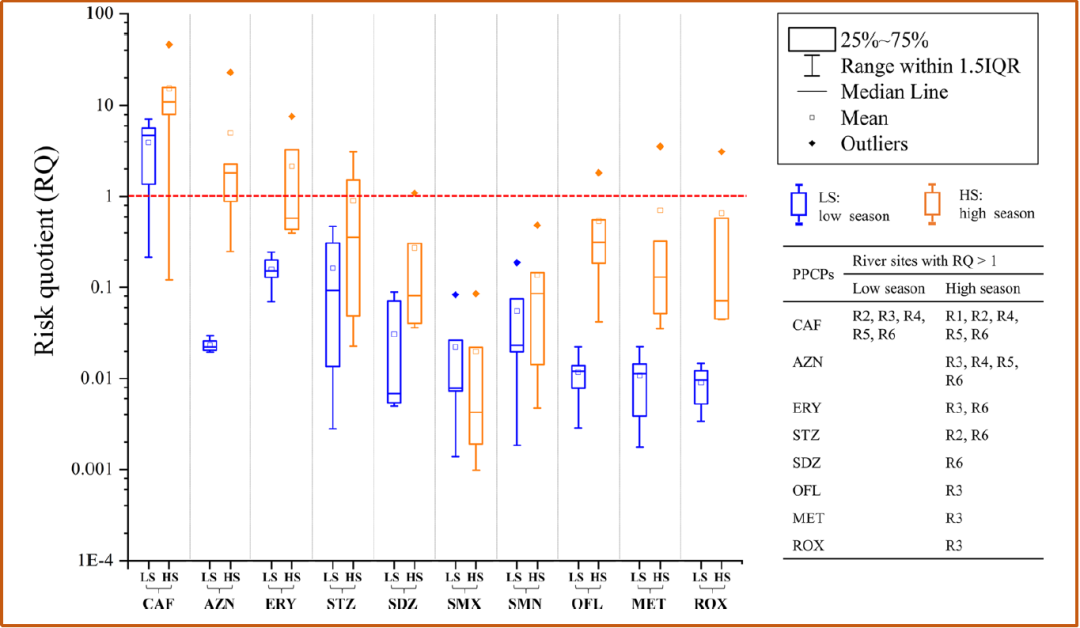 河水中7种主要PPCPs的RQ超过1,表明淡水生态系统具有较高的慢性生态风险,混合物造成的风险可能更为严重。