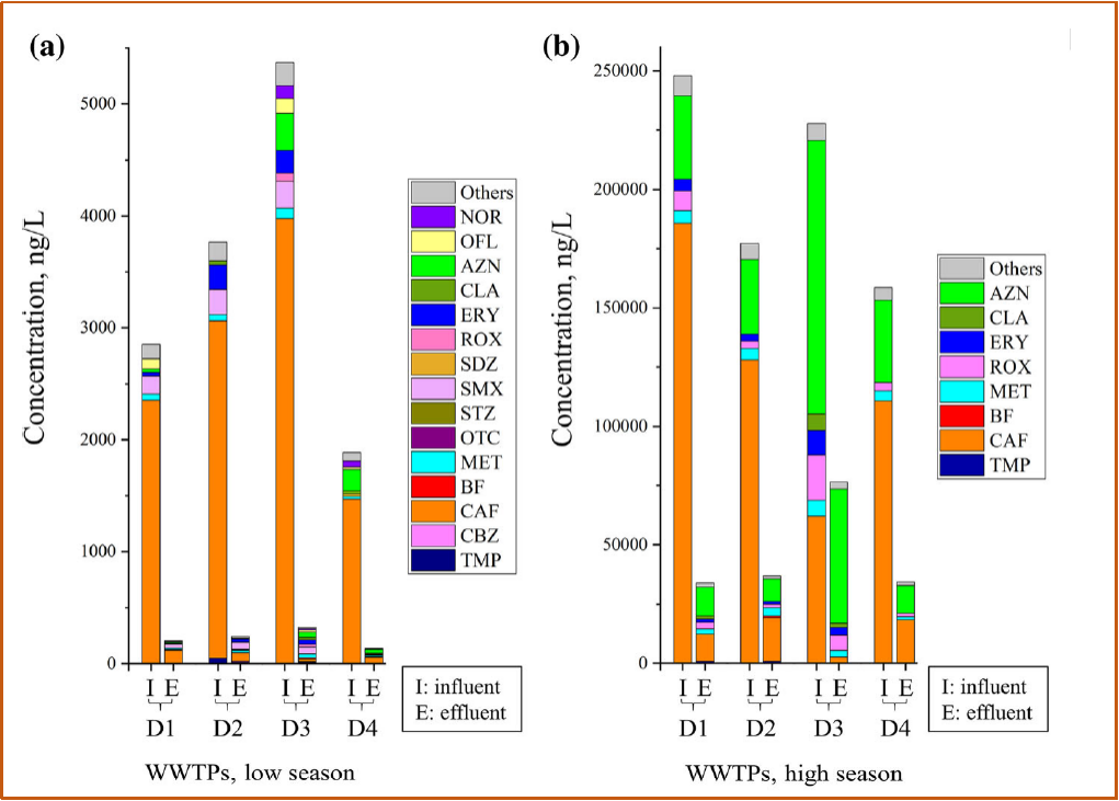 污水处理厂中PPCPs浓度的差异与其服务区域的差异有关。