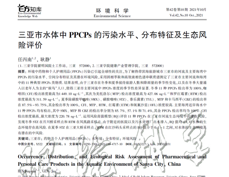 海南省自然科学基金项目“三亚市新型污染物PPCPs的时空分布及风险诊断研究”(420RC673)阶段性成果二:《Emission and ecological risk of pharmaceuticals and personal care products affected by tourism in Sanya City, China》(发表于《Environmental Geochemistry and Health》)
