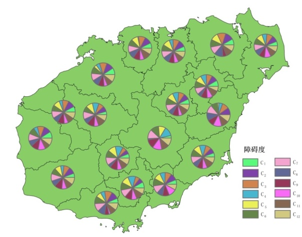 (2)对海南岛各市县区域开展了进一步因子障碍度分析,找到各市县工程性缺水的限制因子及其差异性,可为水资源的合理开发利用和配置提供参考。研究发现中部山区水资源需求压力相对较小而工程利用的先决条件也较差,应以小流域综合治理和水土保持为重点。东北部评价等价较差的区域,限制因子主要集中在用水效率指标上,要改善上述评价结果较差市县的工程性缺水问题,提高农业和工业用水效率是其改善的主要途径之一,建立节水型农业和工业是最基本的行动计划,因此,研究和推广高效率的田间配水系统及灌溉计划、开发和种植低耗水作物、选择合适的工业发展项目和提高水重复利用率等方面可作为后续工作的重点方向。单位面积库容(C5)障碍度排名靠后而人均水资源量(C3)较多的市县主要有琼海、东方和琼中,可作为其他市县引水提水工程的水源地。此外,海口、儋州和临高等沿海市县,人均水资源量较低,其水资源开发利用率已经超过了30%,新建引水提水工程和海水淡化等开源性手段可作为改善工程性缺水问题的主要途径。
