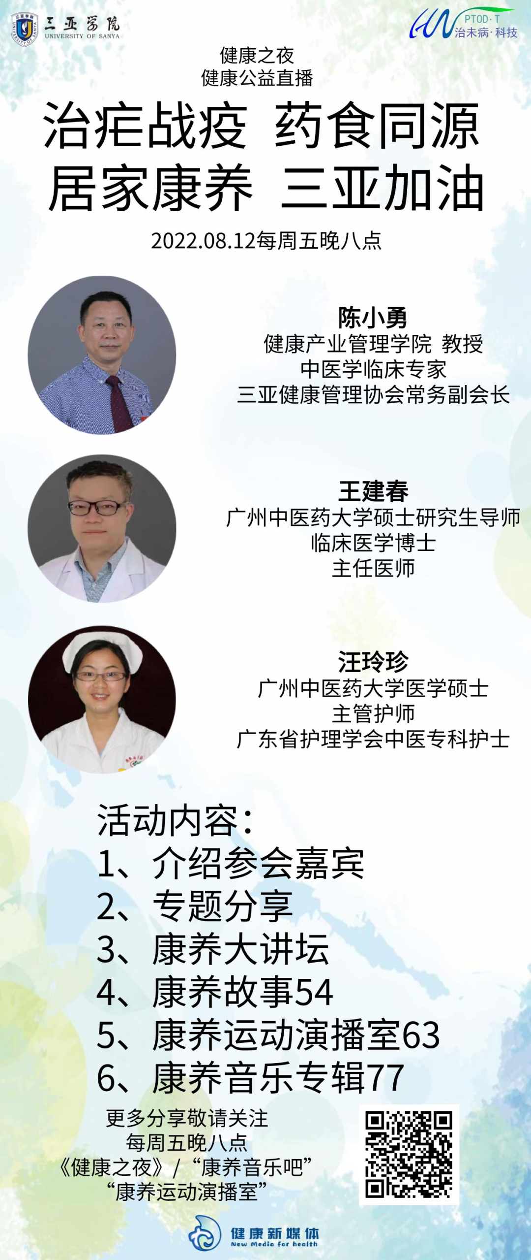 本周五晚20:00健康之夜“治疟战疫 药食同源 居家康养 三亚加油”专题活动期待您的到来。