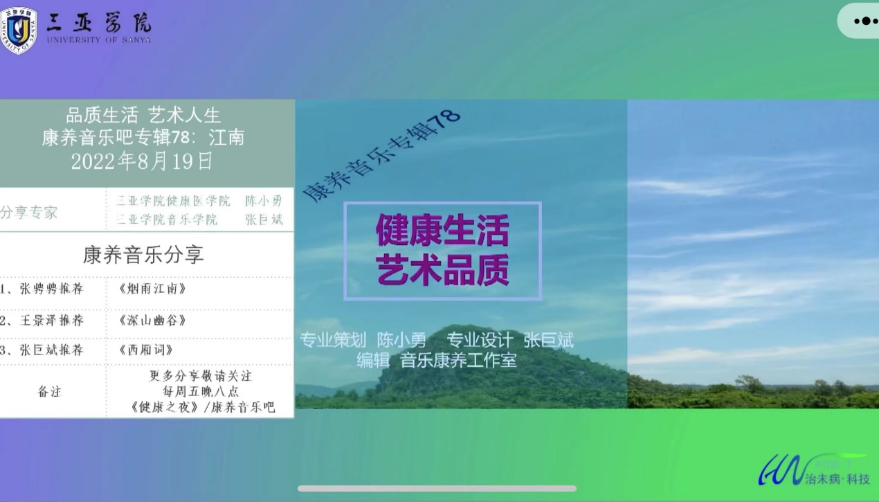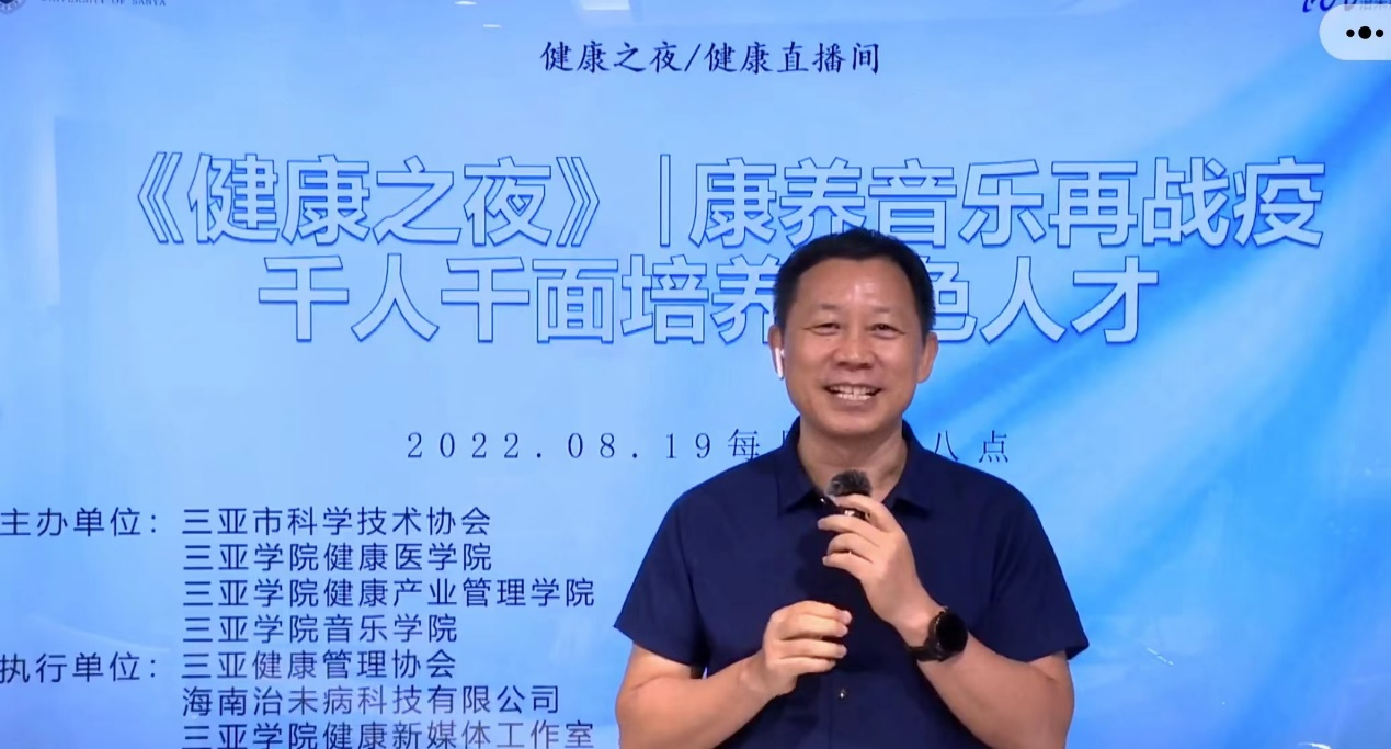 2022年8月19日晚八点新葡的京集团350vip8888/新葡的京集团350vip8888在线开展了以“康养音乐再战疫,千人千面培养特色人才”为专题的健康之夜活动。本次活动由新葡的京集团350vip8888、中国健康促进与教育协会健康产业专业委员会、中国中医药研究促进健康旅游分会指导;三亚市科协、新葡的京集团350vip8888新葡的京集团350vip8888/新葡的京集团350vip8888/音乐公司联合主办,三亚健康管理学会、新葡的京集团350vip8888健康新媒体;海南治未病科技有限公司联合执行,新葡的京集团350vip8888健康管理中心、新葡的京集团350vip8888音乐康养工作室、新葡的京集团350vip8888康养运动队支持。本次活动邀请了新葡的京集团350vip8888教授,中医学临床专家,《健康之夜》栏目创始人陈小勇教授和新葡的京集团350vip8888音乐公司经理,海南省领军人物张巨斌教授出席本期健康之夜,交流康养音乐防控疫情及“千人千面”培养康养产业特色人才。