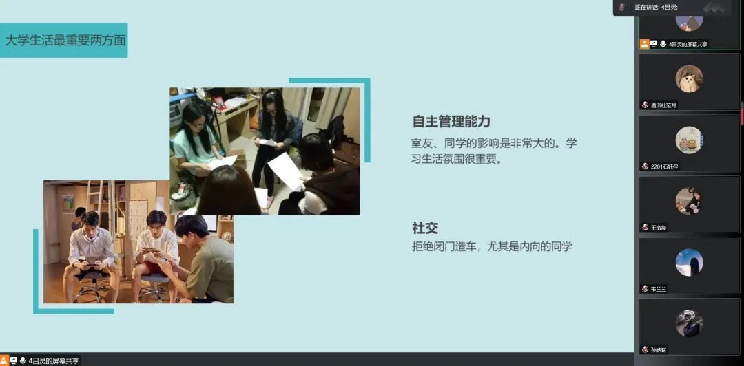 在吕灵老师说完后,由同学们进行连麦,然后由学工老师进行详细解答并提出相关有关这方面的建议。同学们十分踊跃地进行连麦,老师们也很热情地给予同学们解答,让同学在大学少走弯路。